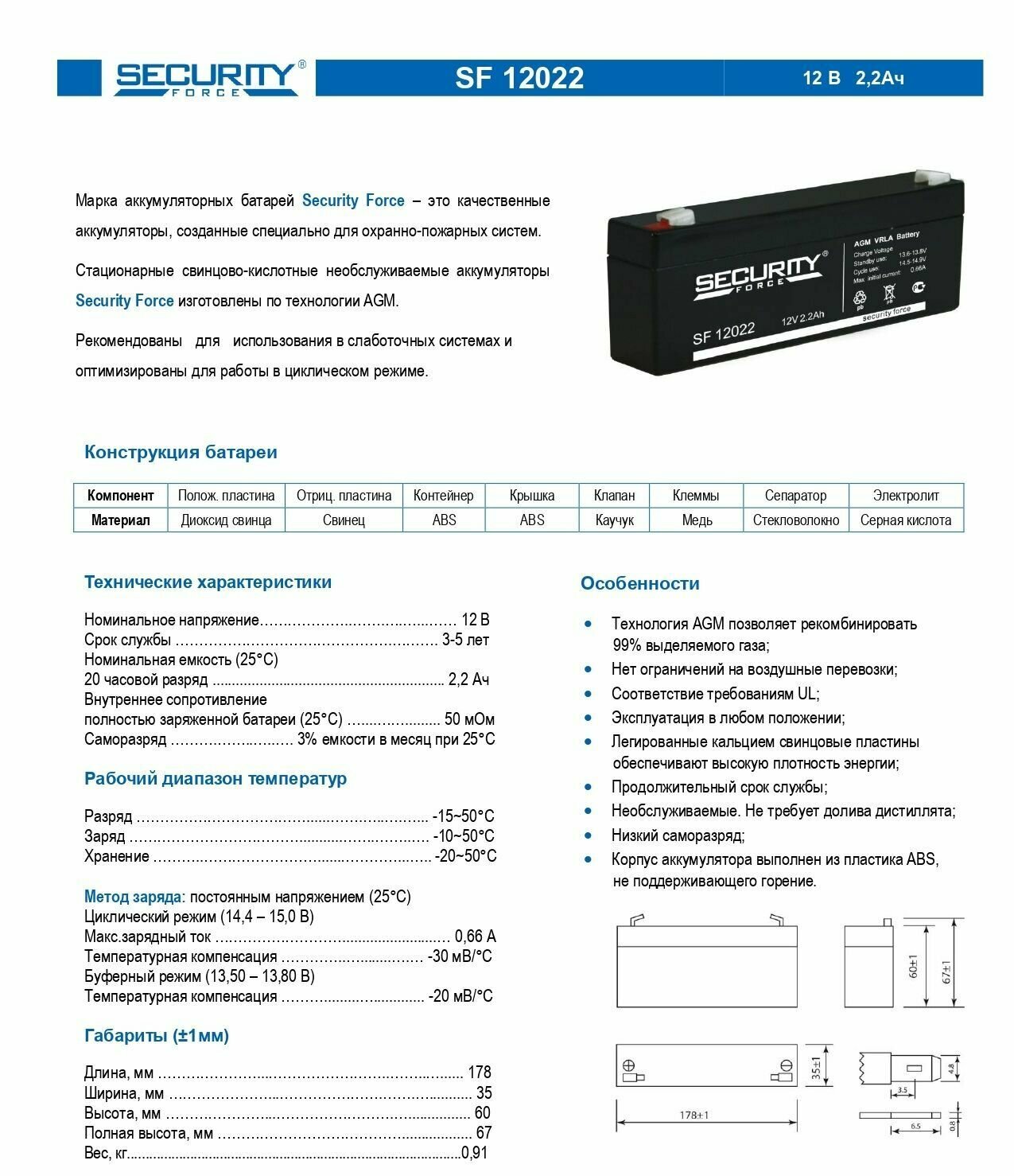 Аккумулятор Security Force SF 12022 12V 2.2Ah