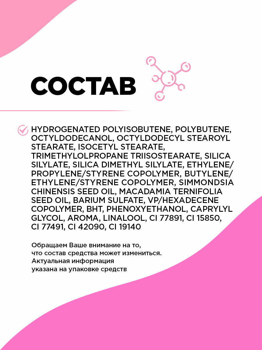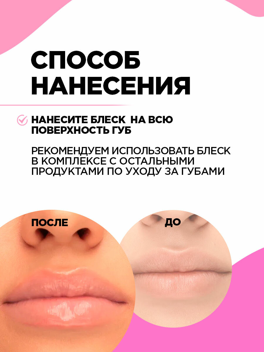 | Способ применения | наносите блеск аппликатором от середины губ к контуру. Для большего объема немного выйдите за границы верхней губы. Блеск можно использовать самостоятельно или наносить поверх помады |