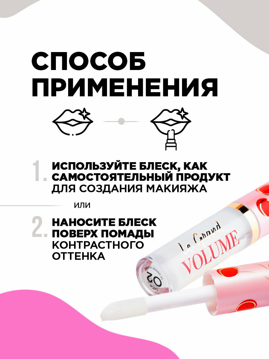 | Способ применения | наносите блеск аппликатором от середины губ к контуру. Для большего объема немного выйдите за границы верхней губы. Блеск можно использовать самостоятельно или наносить поверх помады |