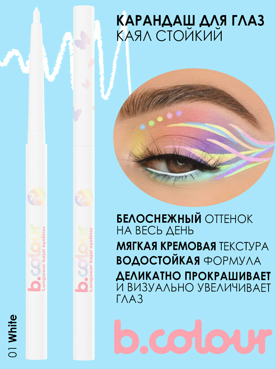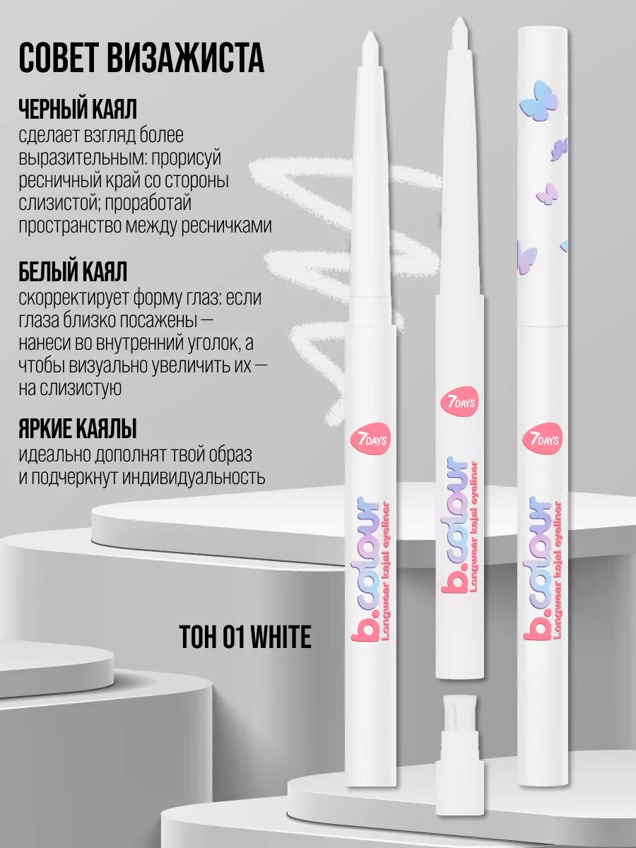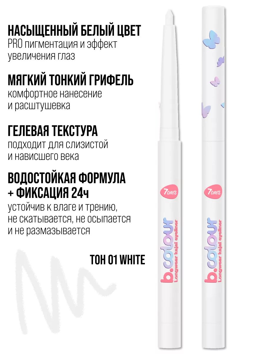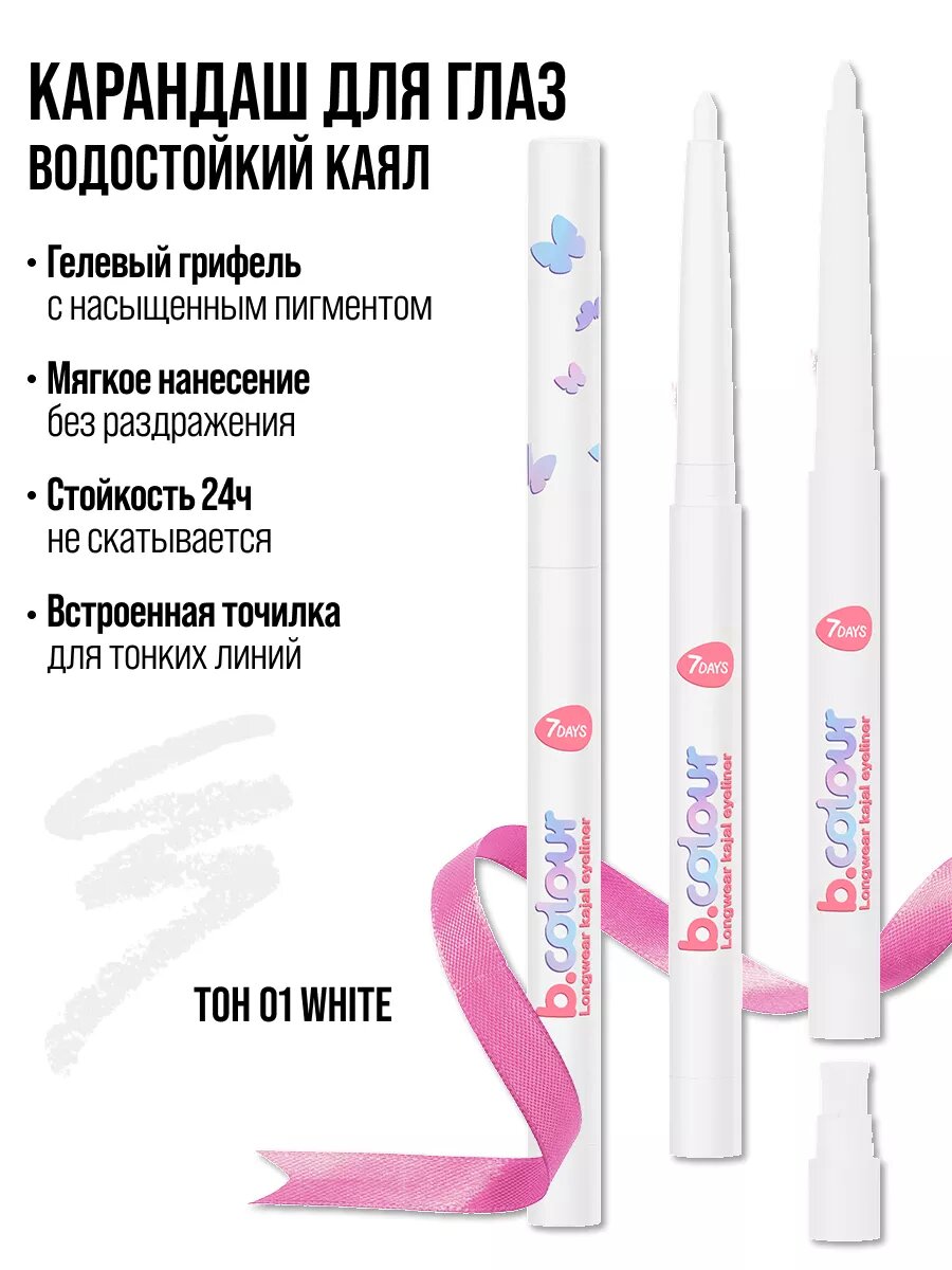 Карандаш для глаз белый 7DAYS B.COLOUR каял водостойкий автоматический, лайнер 01 WHITE