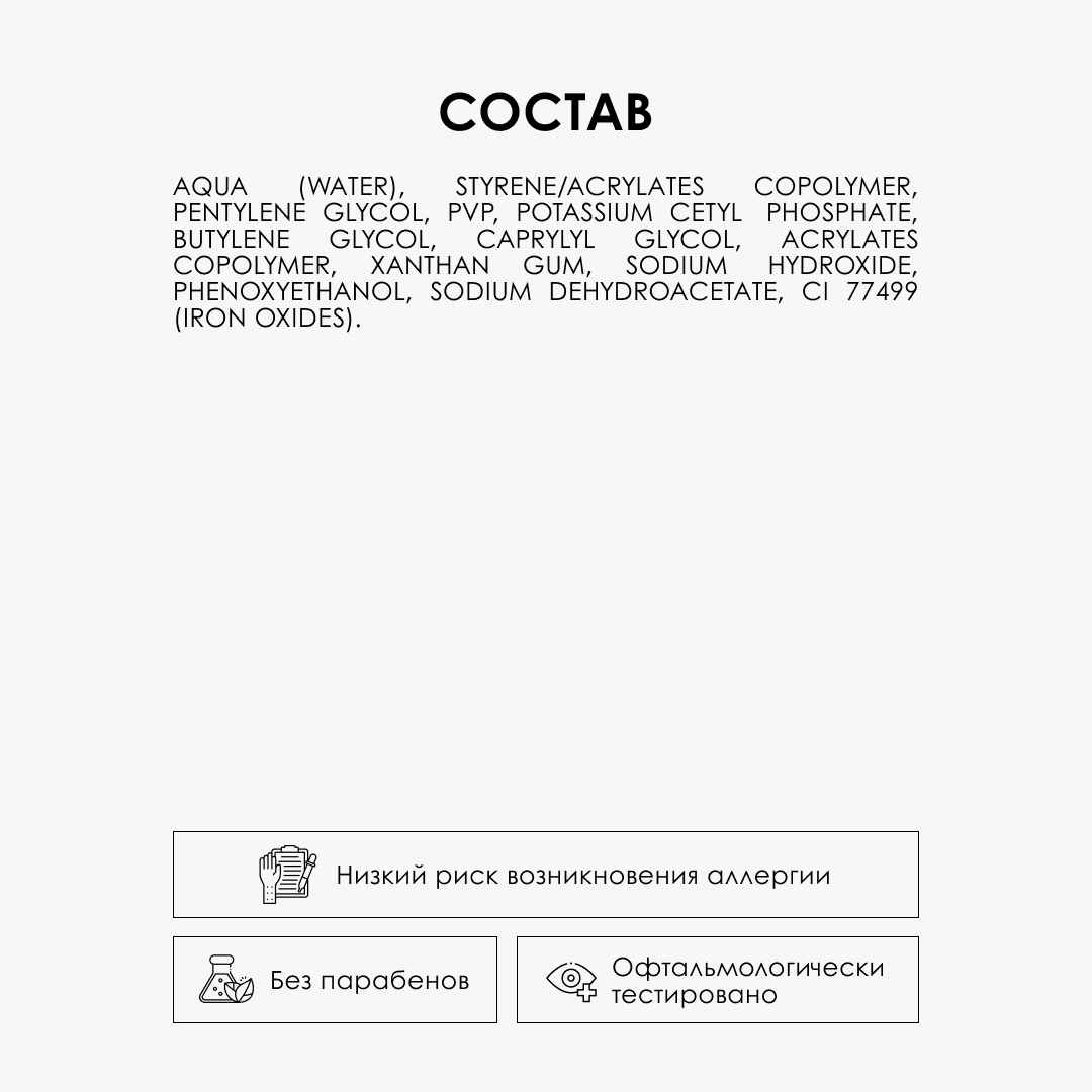 | Состав | aqua (water), styrene/acrylates copolymer, pentylene glycol, pvp, potassium cetyl phosphate, butylene glycol, caprylyl glycol, acrylates copolymer, xanthan gum, sodium hydroxide, phenoxyethanol, sodium dehydroacetate, ci 77499 (iron oxides) |