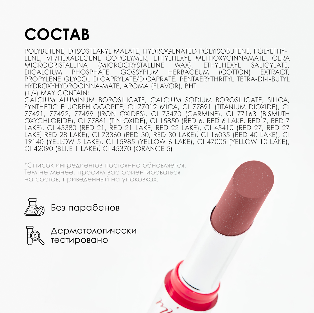 | Состав | polybutene, diisostearyl malate, hydrogenated polyisobutene, polyethylene, vp/hexadecene copolymer, ethylhexyl methoxycinnamate, cera microcristallina (microcrystalline wax), ethylhexyl salicylate, dicalcium phosphate, gossypium herbaceum (cotton) extract, propylene glycol dicaprylate/dicaprate, pentaerythrityl tetra-di-t-butyl hydroxyhydrocinnamate, aroma (flavor), bht; (+/-) may contain: calcium aluminum borosilicate, calcium sodium borosilicate, silica, synthetic fluorphlogopite, ci 77019 mica, ci 77891 (titanium dioxide), ci 77491, 77492, 77499 (iron oxides), ci 75470 (carmine), ci 77163 (bismuth oxychloride), ci 77861 (tin oxide), ci 15850 (red 6, red 6 lake, red 7, red 7 lake), ci 45380 (red 21, red 21 lake, red 22 lake), ci 45410 (red 27, red 27 lake, red 28 lake), ci 73360 (red 30, red 30 lake), ci 16035 (red 40 lake), ci 19140 (yellow 5 lake), ci 15985 (yellow 6 lake), ci 47005 (yellow 10 lake), ci 42090 (blue 1 lake), ci 45370 (orange 5) |