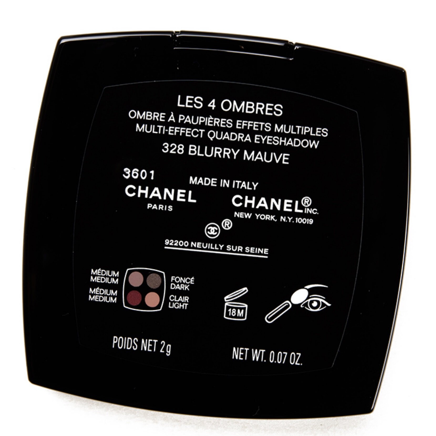 | Способ применения | Каждая гармония состоит из: • Двух средних оттенков, которые можно смешивать вместе или наносить контрастно, • Один темный оттенок для усиления, придания формы и глубины, • Один светлый оттенок для освещения и создания эффекта широко открытых глаз. Каждой функции отведено свое место в футляре. Чтобы помочь вам при первом нанесении, студия создания макияжа CHANEL предлагает четыре способа нанесения LES 4 OMBRES: естественный шик, утонченный, соблазнительный или smoky eyes. |