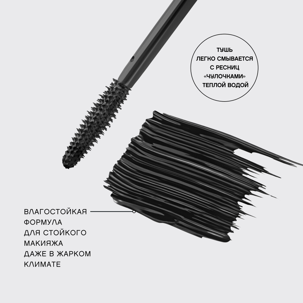 | Способ применения | Наносите зигзагообразными движениями, прокрашивая ресницы от корней до кончиков. Тушь можно наслаивать, усиливая эффект без комочков. |