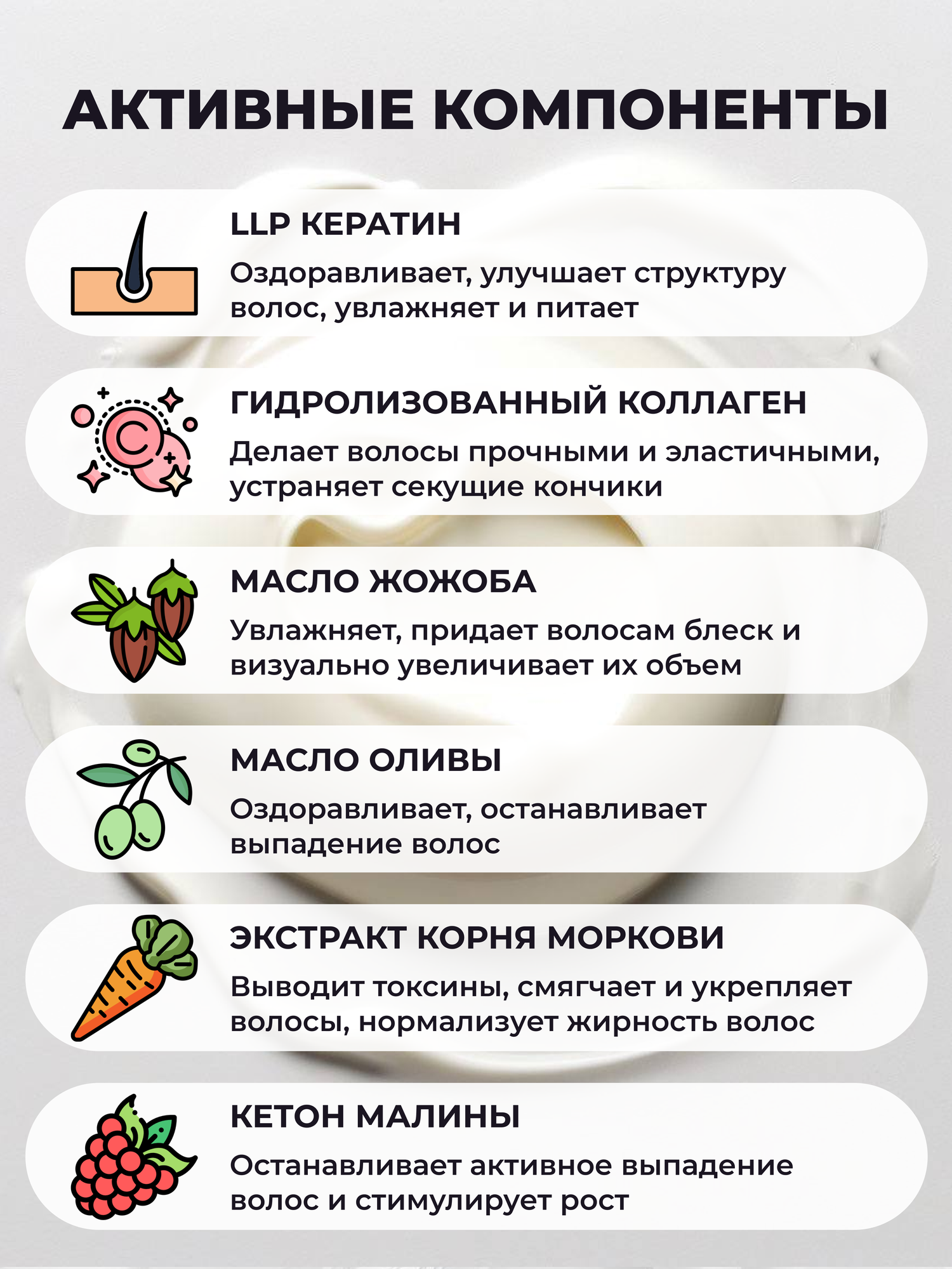 | Активный ингредиент | аллантоин / аминокислоты / витамин E / гиалуроновая кислота / глицерин / керамиды / кератин / коллаген / лимонная кислота / молочная кислота / ниацинамид / пантенол / пептиды / протеины / протеины шелка / цетримониум хлорид / яблочный уксус |