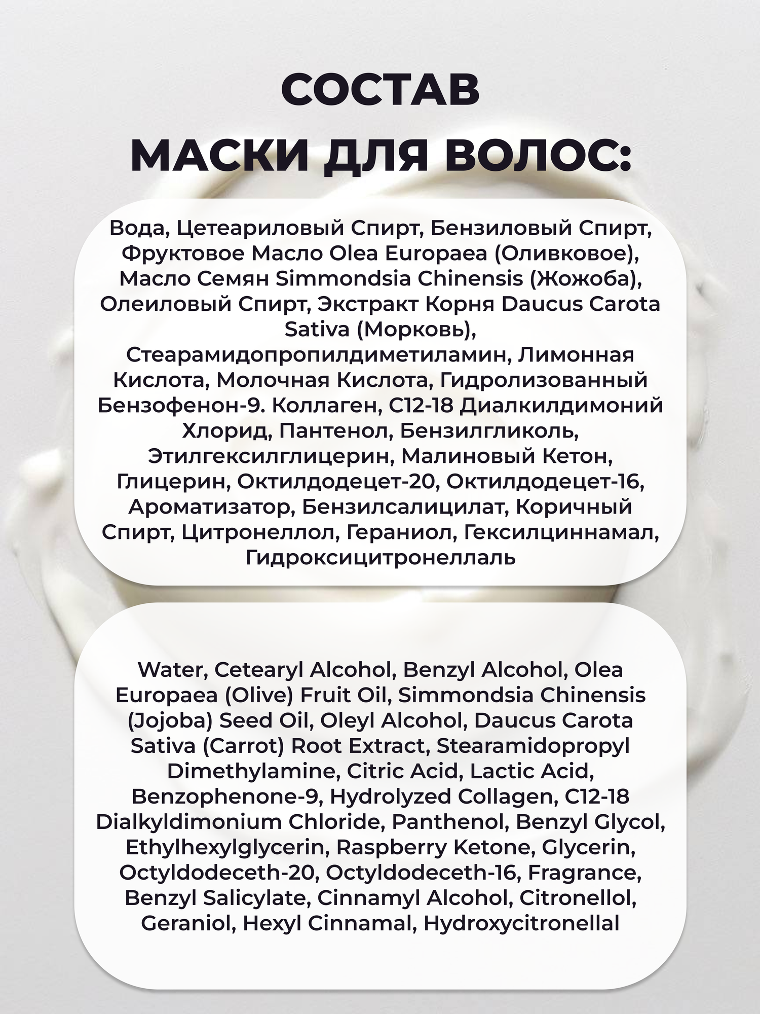 | Состав | water, cetearyl alcohol, benzyl alcohol, olea europaea (olive) fruit oil, simmondsia chinensis (jojoba) seed oil, oleyl alcohol, daucus carota sativa (carrot) root extract, stearamidopropyl dimethylamine, citric acid, lactic acid, benzophenone-9, hydrolyzed collagen, c12-18 dialkyldimonium chloride, panthenol, benzyl glycol, ethylhexylglycerin, raspberry ketone, glycerin, octyldodeceth-20, octyldodeceth-16, fragrance, benzyl benzoate, limonene, hexyl cinnamal, linalool, butylphenyl methylpropional |
