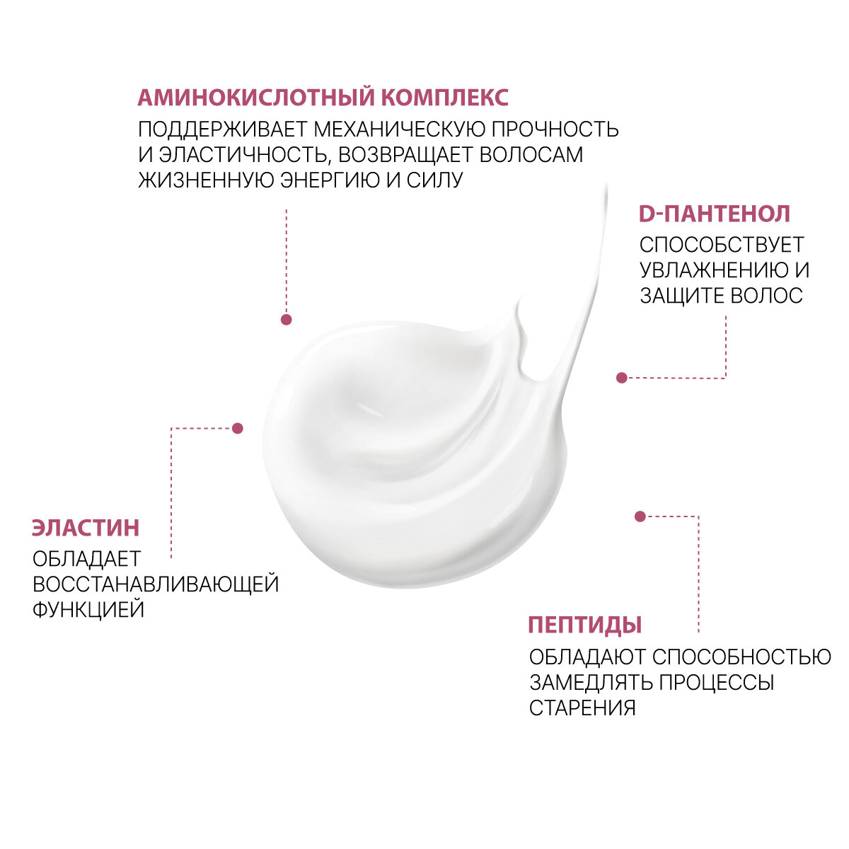 | Активный ингредиент | аминокислоты / кератин / никотиновая кислота / пантенол / пептиды / эластин |