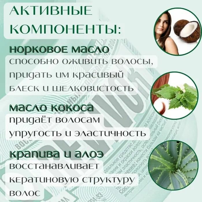 | Масла и экстракты | кокосовое масло / масло авокадо / экстракт алоэ / экстракт зверобоя / экстракт крапивы / экстракт хвоща |