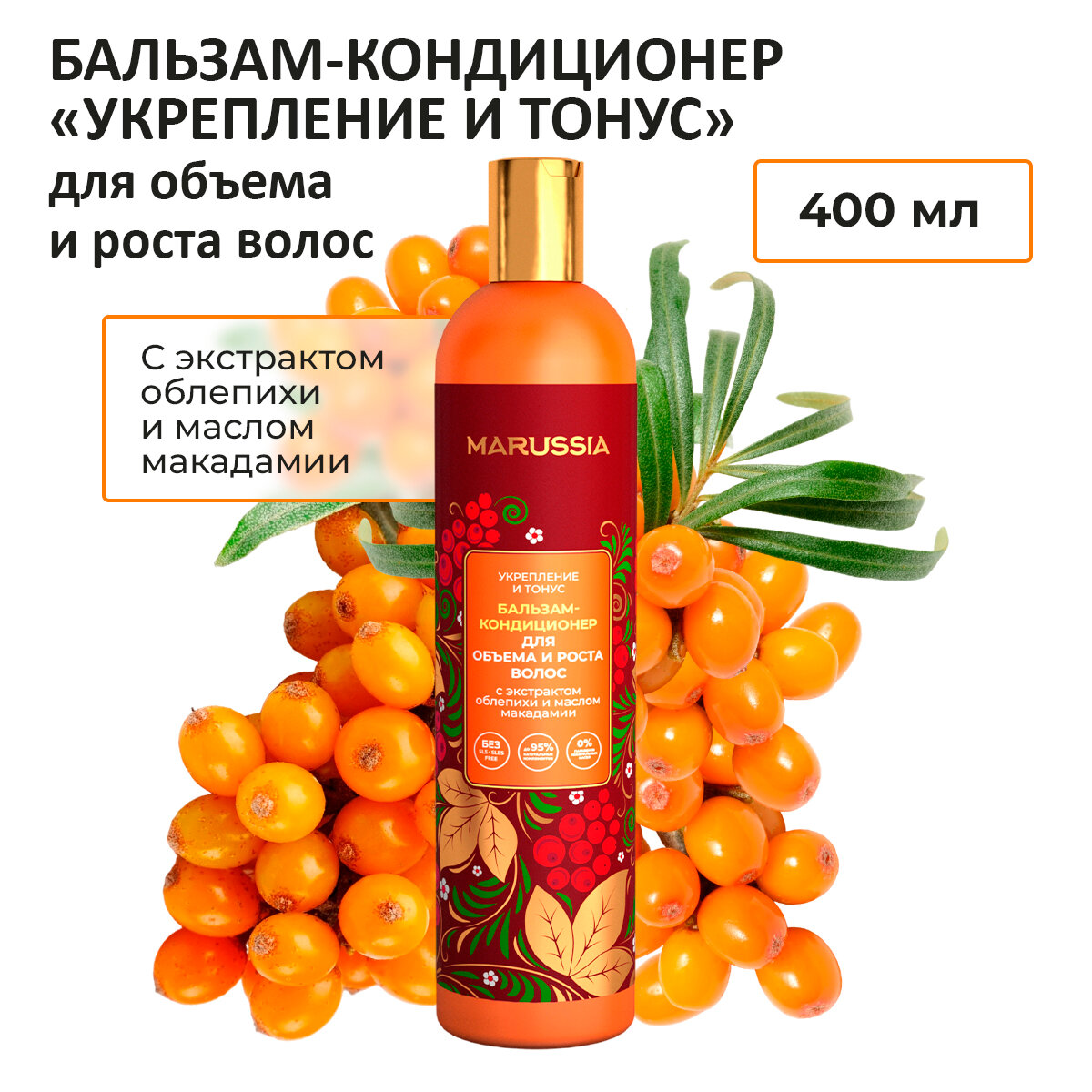 Marussia Бальзам - кондиционер для волос женский, мужской, «Укрепление и тонус» с экстрактом облепихи и маслом макадамии, 400 мл