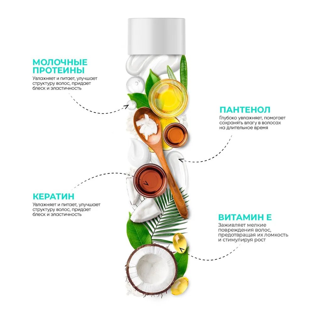 | Активный ингредиент | аминокислоты / аргинин / биотин / витамин A / витамин C / витамин E / витамины группы B / керамиды / кератин / кокосовое молоко / коллаген / пантенол / протеины / цетримониум хлорид / эластин |
