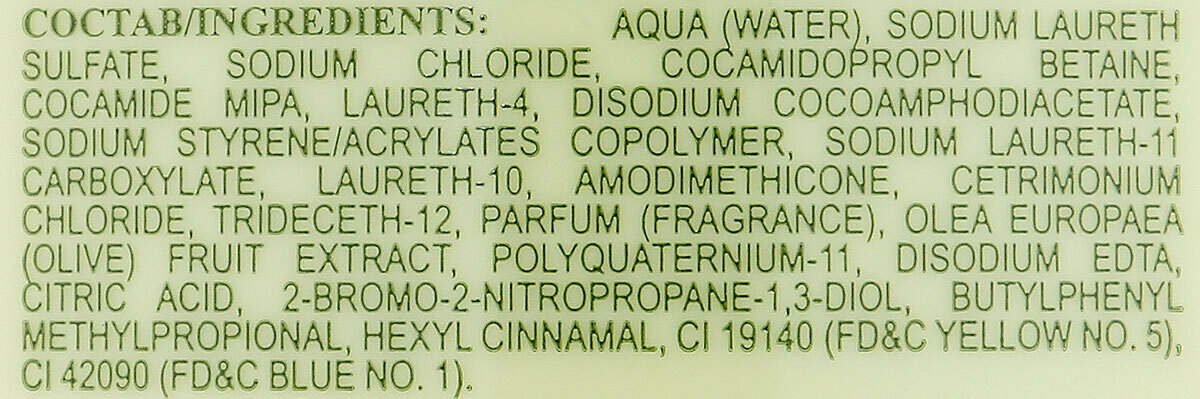 | Состав | вода, лауретсульфат натрия, кокамидопропилбетаин, хлорид натрия, кокамид МИПА, лаурет-4, кокоамфодиацетат динатрия, экстракт оливы, лаурет-11 карбоксилат натрия, лаурет-10, амодиметикон, цетримониум хлорид, тридецет-12, поликватерниум-11, сополимер стирола и акрилатов натрия, ЭДТА, лимонная кислота, парфюмерная композиция, 2-бром-2-нитропропан-1,3-диол, CI 19140, CI 19140/42090 |