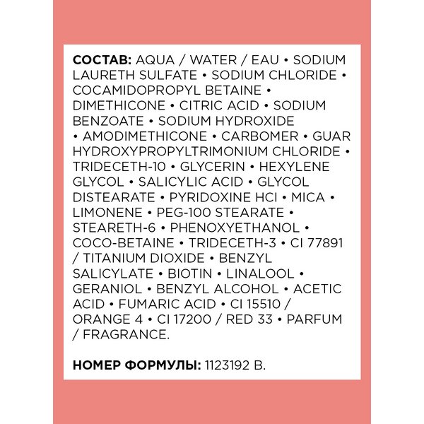| Состав | aqua/water, sodium laureth sulfate, sodium chloride, cocamidopropyl betaine, dimethicone, sodium benzoate, amodimethicone, carbomer, guar hydroxypropyltrimonium chloride, trideceth-10, glycerin, hexylene glycol, salicylic acid, glycol distearate, pyridoxine hcl, citric acid, mica, limonene, peg-100 stearate, steareth-6, phenoxyethanol, coco-betaine, trideceth-3, ci 77891/titanium dioxide, peg-45m, benzyl salicylate, biotin, linalool, geraniol, benzyl alcohol, acetic acid, fumaric acid, ci 15510/orange 4, ci 17200/red 33, bht, sodium hydroxide, parfum/fragrance |