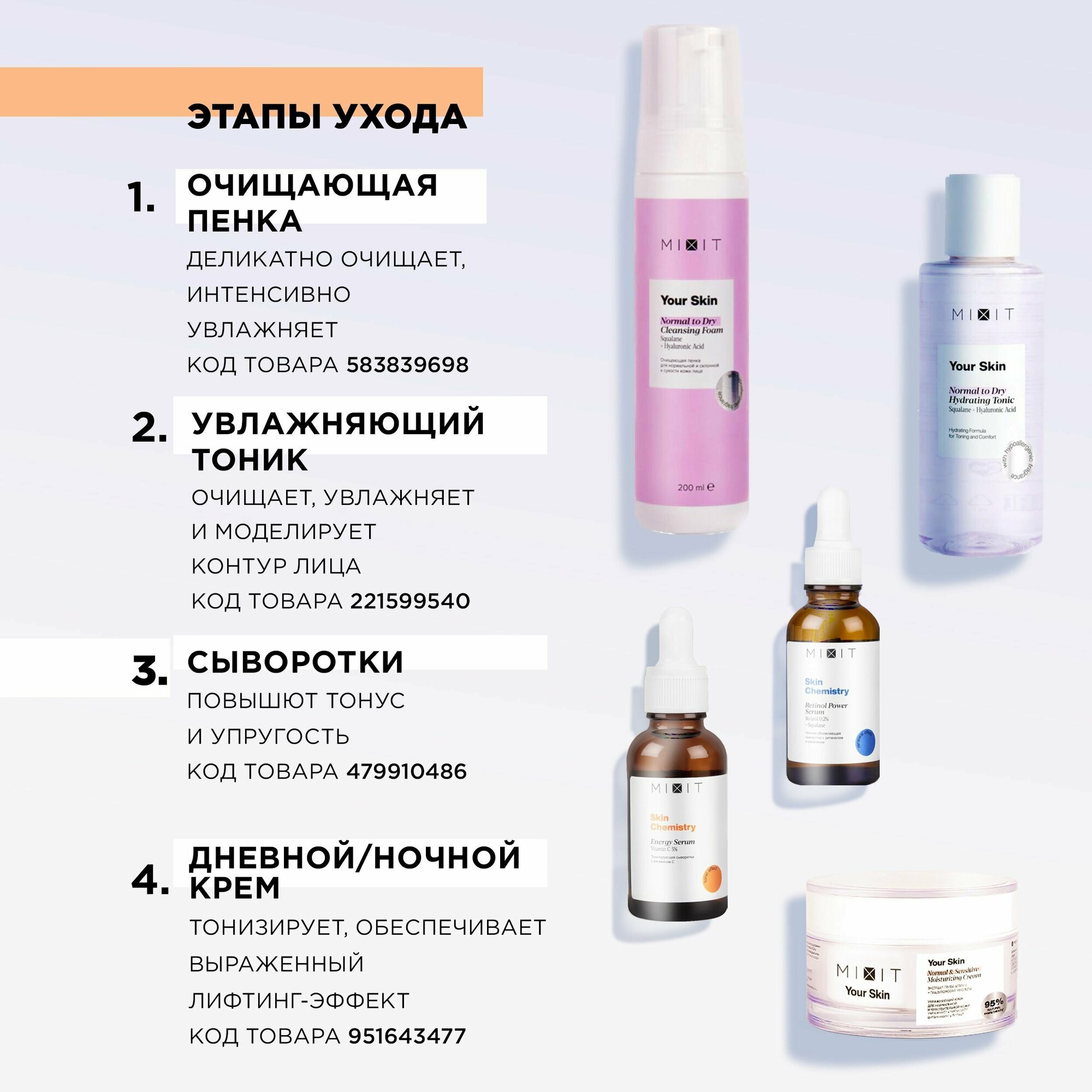 | Способ применения | нанеси на очищенную кожу лица. Подходит для ежедневного использования. Эффективнее в комплексе с другими средствами коллекции YOUR SKIN Normal to Dry |