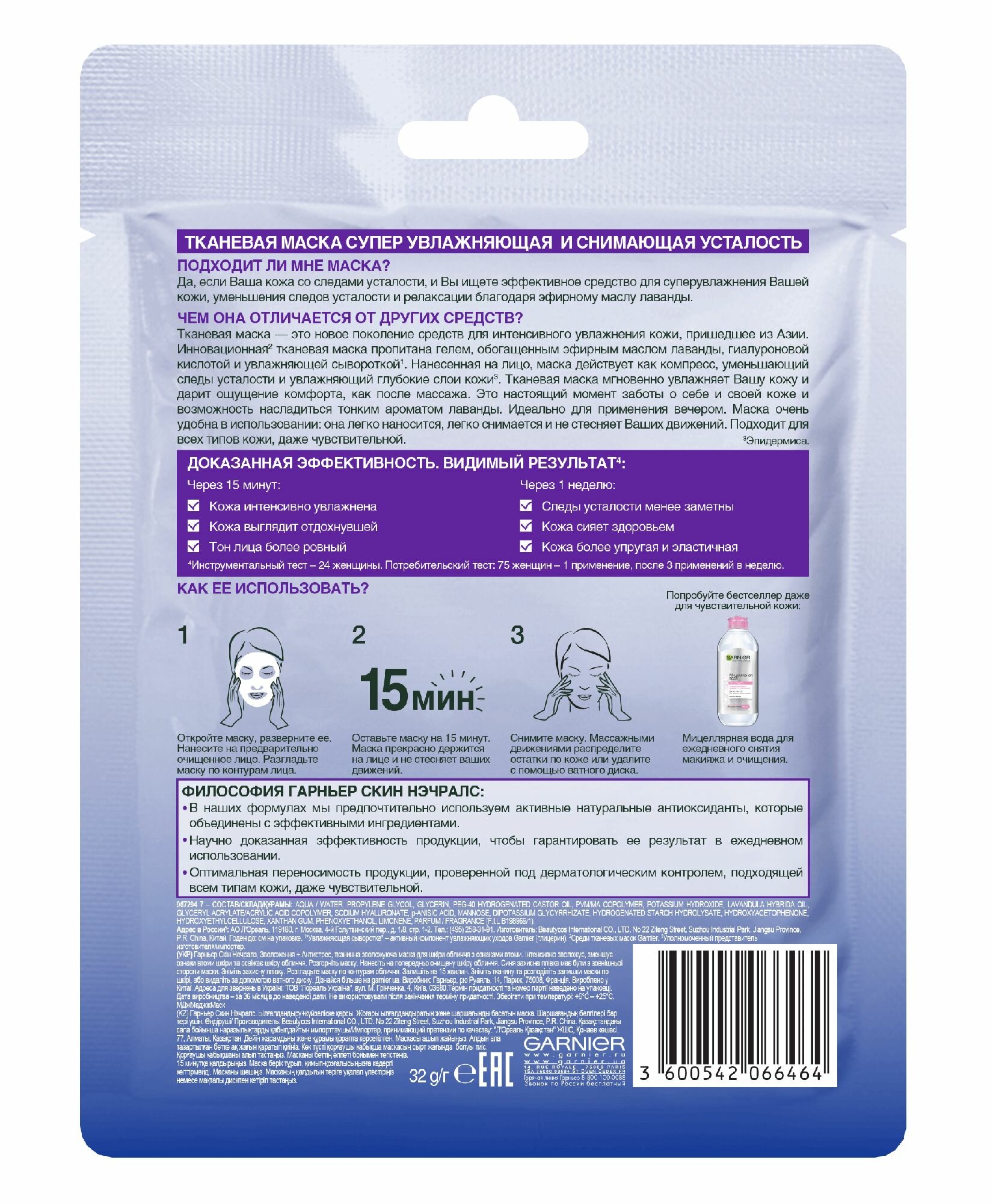 GARNIER тканевая маска Увлажнение + Антистресс, 32 г, 32 мл интересное: