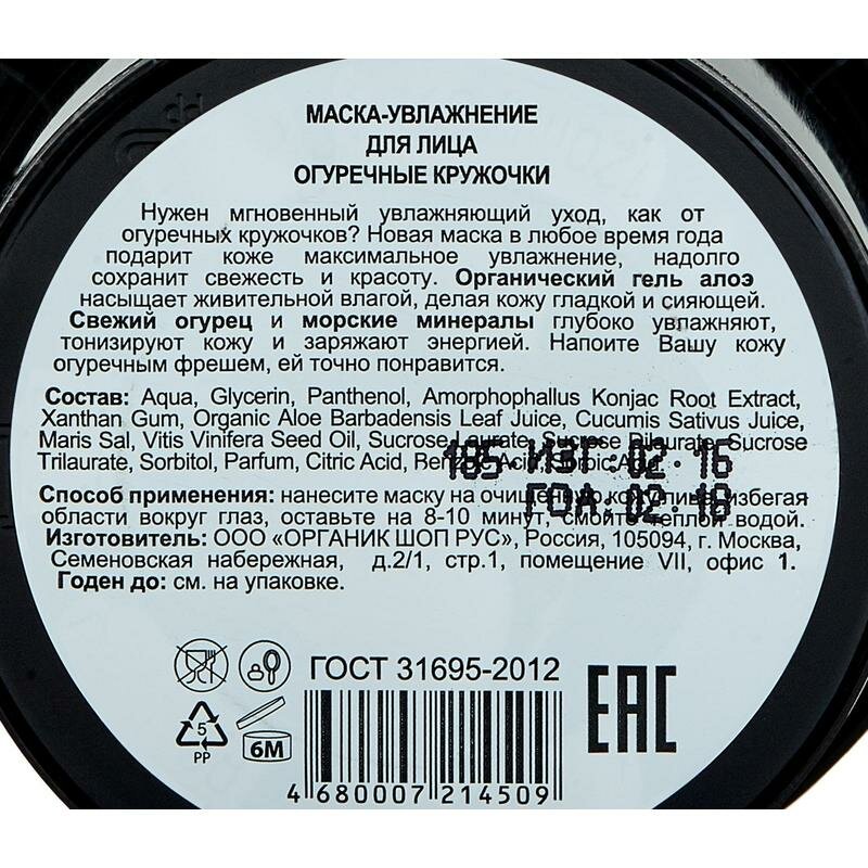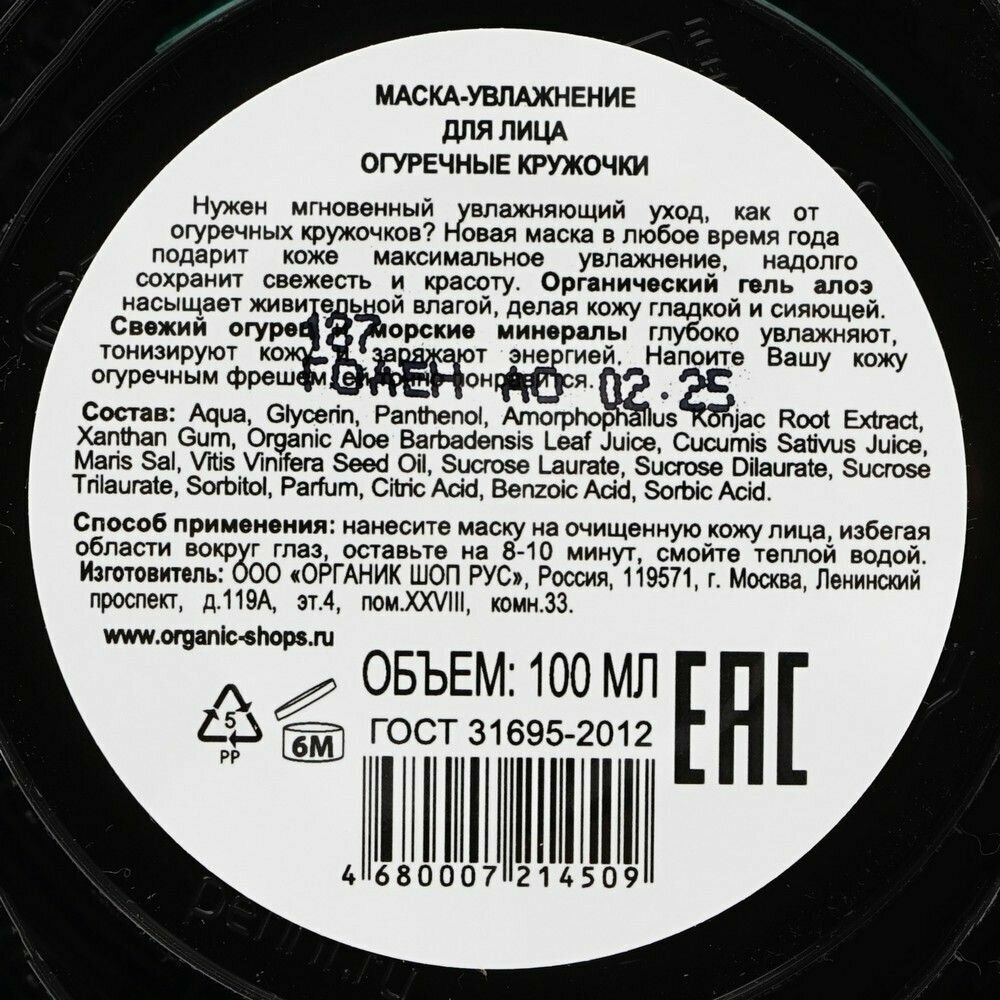 Маска-увлажнение Organic Shop для лица Огуречные кружочки, 100 мл