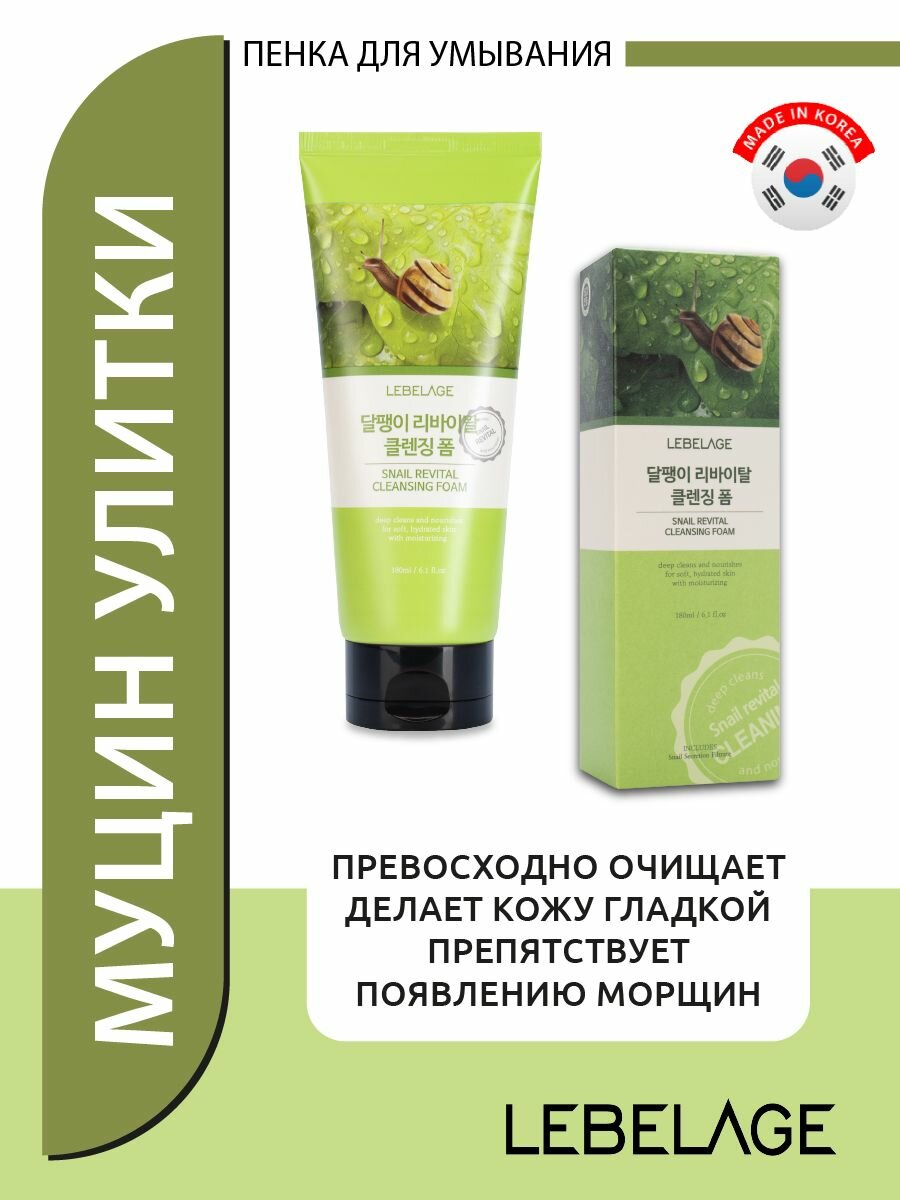 Lebelage Пенка для умывания, для снятия остатков макияжа, для ухода за кожей лица, шеи и зоны декольте с улиточным муцином, корейская косметика. 180 мл
