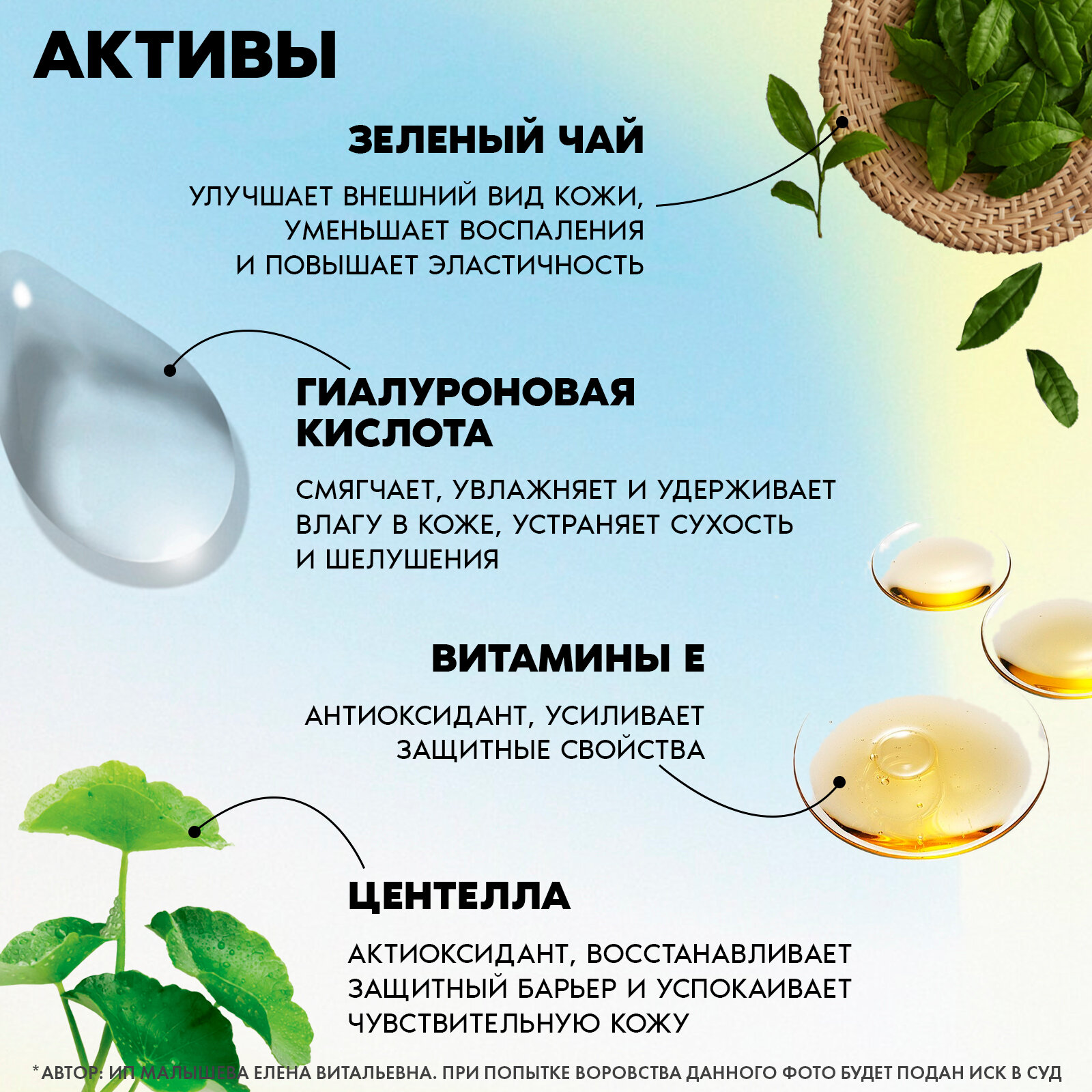 | Активные ингредиенты | бисаболол, витамин А, витамин Е, витамин С, пептиды, сквалан, центелла азиатская |