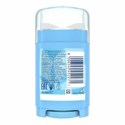 | Полный состав | Dimethicone, Aluminum Zirconium Trichlorohydrex Gly, Stearyl Alcohol, Paraffinum Liquidum, C12-15 Alkyl Benzoate, Hydrogenated Castor Oil, Talc, Petrolatum, Aqua, Glycine, PEG-8 Distearate, PPG-14 Butyl Ether, Parfum, Cyclodextrin, Behenyl Alcohol, Hexyl Cinnamal, Hydroxycitronellal, Citronellol, Linalool, Arachidyl Alcohol, Geraniol, Benzyl Benzoate, BHT |