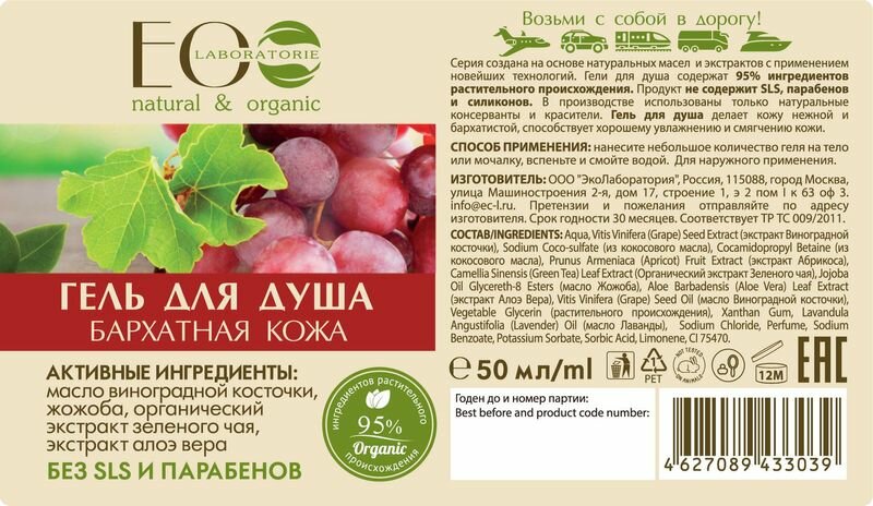| Состав | Aqua, Sodium Coco-Sulfate, Cocamidopropyl Betaine, Glycerin (растительного происхождения), Vitis Vinifera Fruit Extract (экстракт винограда), Prunus Armeniaca Fruit Extract (экстракт абрикоса), Camellia Sinensis Leaf Extract* (органический экстракт зеленого чая), Aloe Barbadensis Leaf Extract (экстракт алоэ вера), Simmondsia Chinensis Seed Oil (масло жожоба), Vitis Vinifera Seed Oil (масло виноградной косточки), Lavandula Angustifolia Oil (эфирное масло лаванды), Sodium Chloride, Glycol Distearate, Dehydroacetic Acid, Benzoic Acid, Benzyl Alcohol, Sodium Benzoate, Potassium Sorbate, Parfum, CI 17200, |