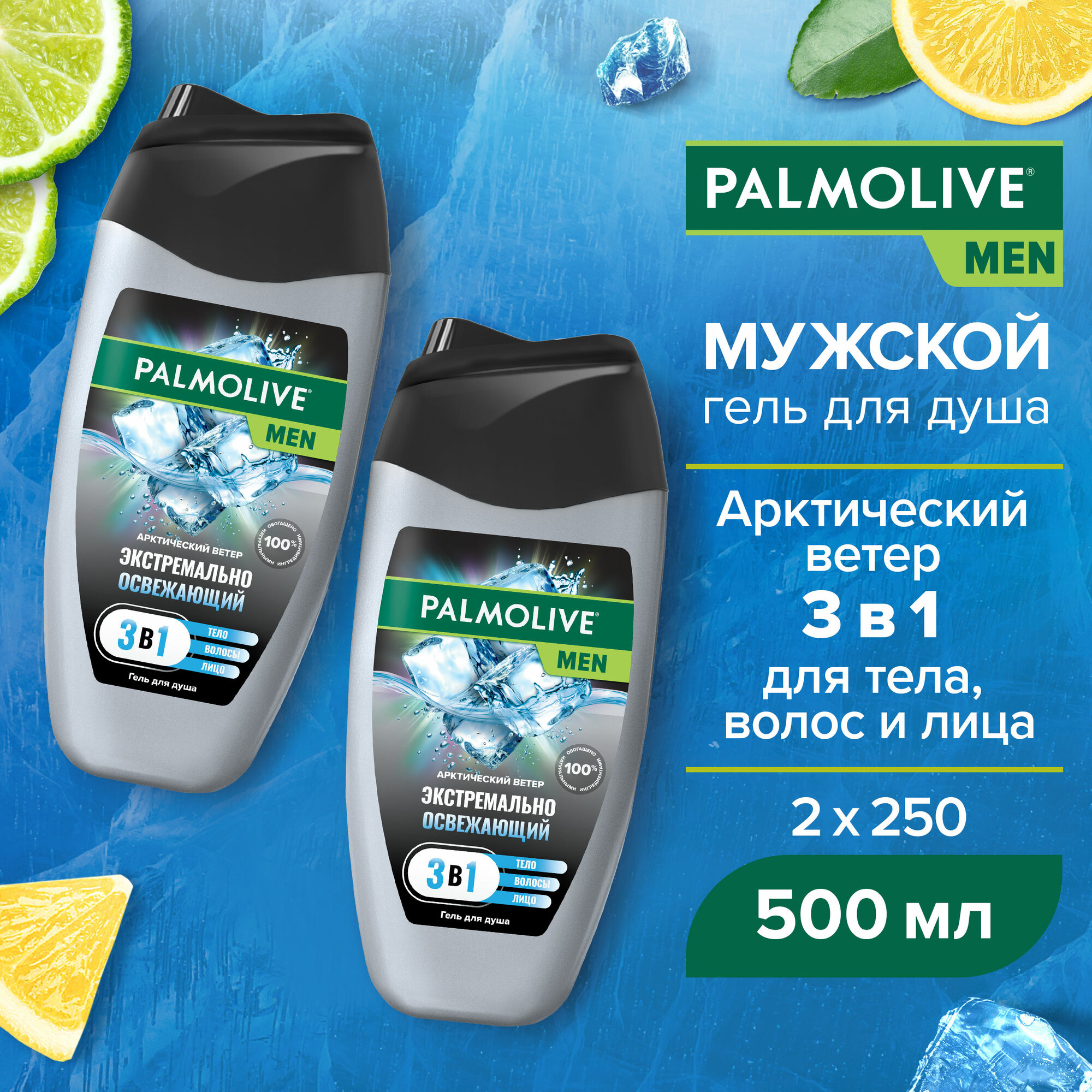 Гель для душа мужской Palmolive MEN Арктический ветер 3 в 1 для тела, волос и лица, 750 мл (2 шт)