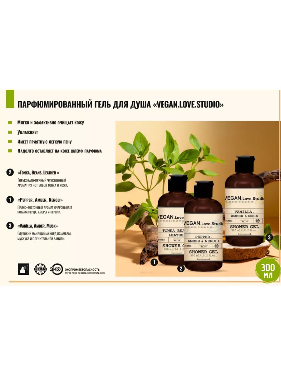 Гель для душа парфюмированный VEGAN.Love.Studio № 10 Vanilla, Amber, Musk, 300 мл. Ваниль, Амбра, Мускус