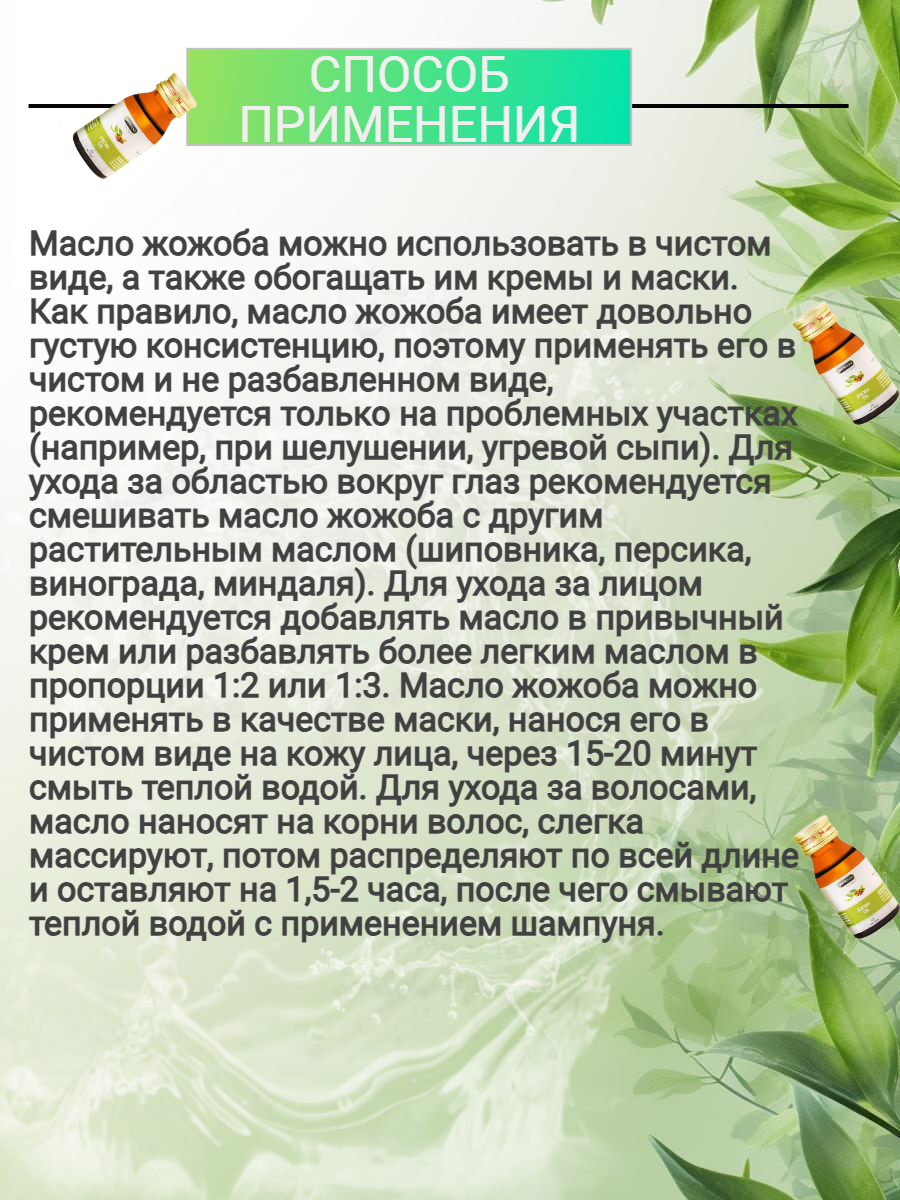 | Способ применения | для ухода за волосами добавлять в другое масло 5 капель на 10 грамм используемого средства |