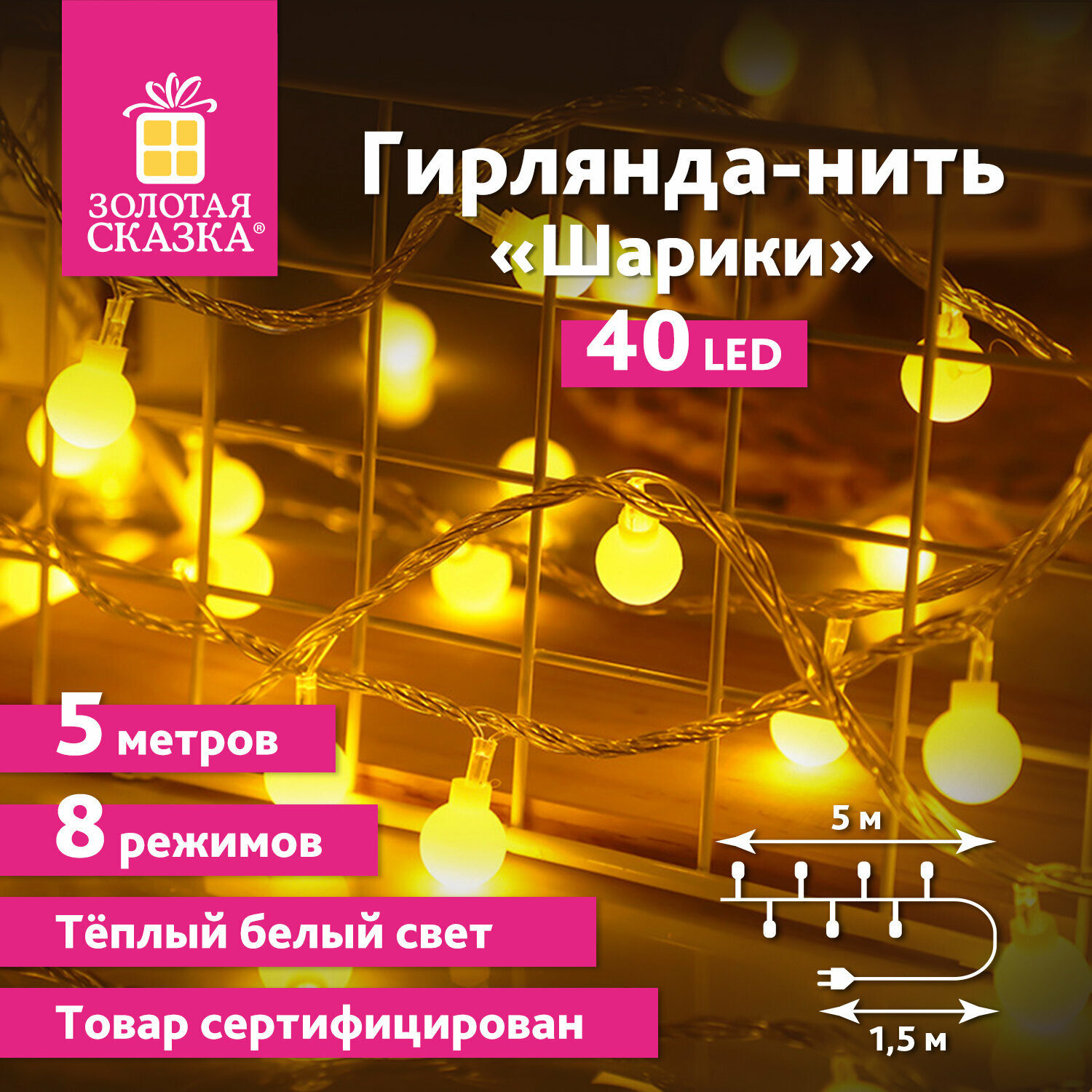 Купить Электрогирлянда-нить комнатная "Шарики" 5 м, 40 LED, теплый белый свет, 220 V, контроллер, золотая сказка, 591348