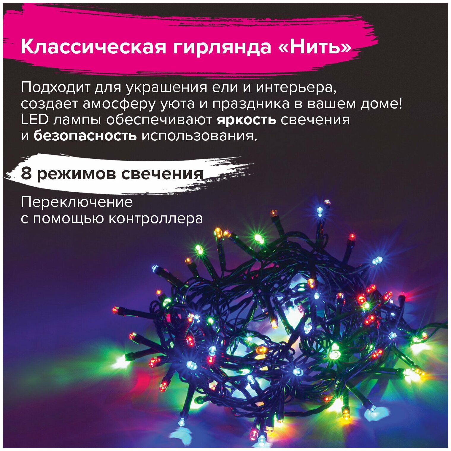 Купить Электрогирлянда-нить комнатная "Стандарт" 5 м, 100 LED, мультицветная, 220 V, контроллер, золотая сказка, 591099