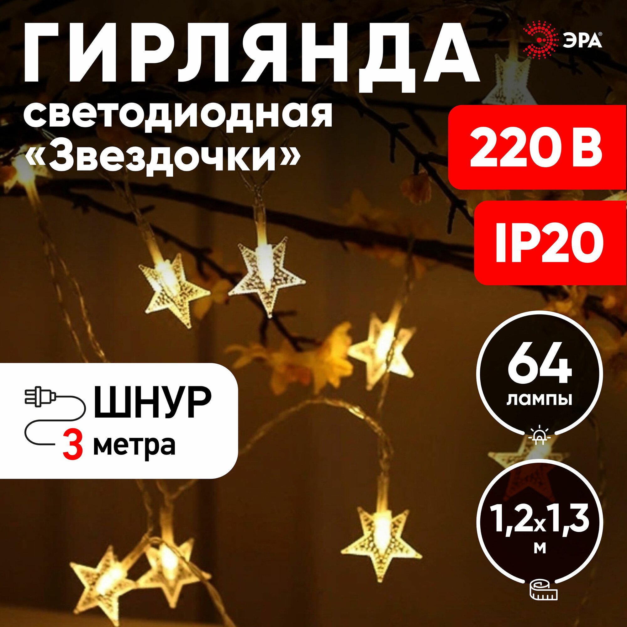 Купить ЭРА Светодиодная новогодняя гирлянда ENIZ64W Звездочки 1,21,3 м теплый белый 64LED IP20 Б0051876
