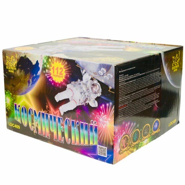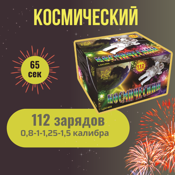 Батарея салютов «Космический» (0.8"–1"–1.2"–1.5" x 112 залпов) + в подарок фонтаны для торта