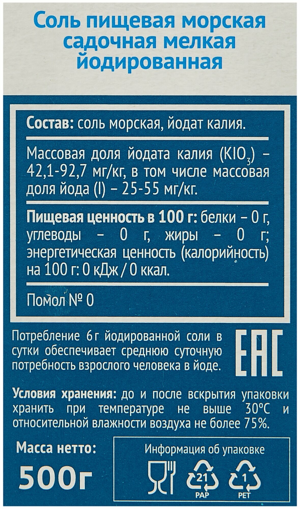 | Дополнительная информация | массовая доля йодата калия (KIO3) – 42,1-92,7 мг/кг, в том числе массовая доля йода (I) – 25-55 мг/кг |