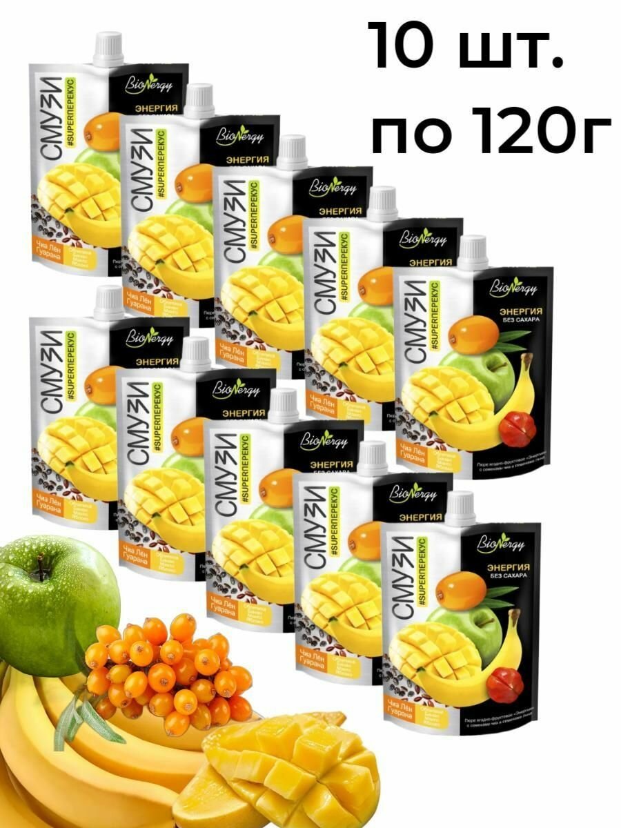 Смузи Энергия без сахара Чиа, лен, гуарана (манго, банан, облепиха, яблоко) BioNergy, 10 шт по 120 гр