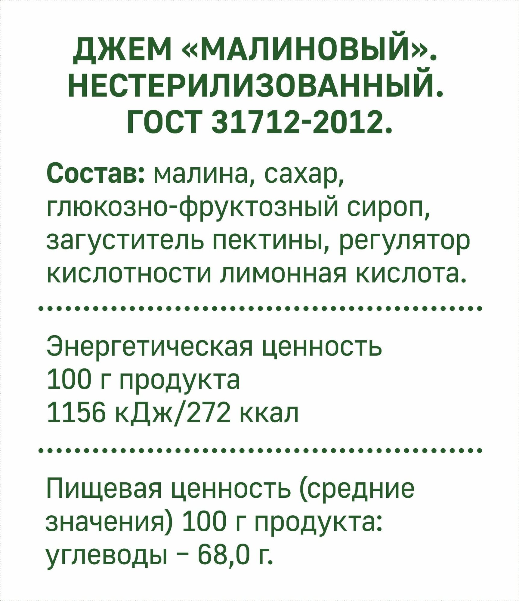 | Состав | малина, сахар, глюкозно-фруктозный сироп, загуститель фруктовый пектин, регулятор кислотности лимонная кислота |