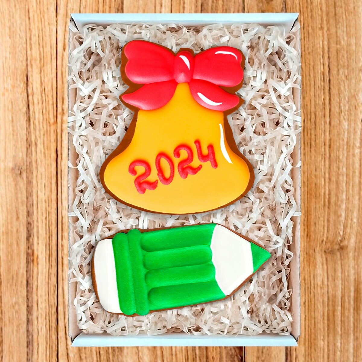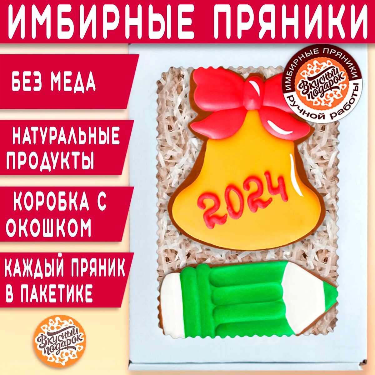Имбирные пряники ручной работы учителю или выпускнику на Последний звонок или Выпускной в школе "Звонок и бордовый карандаш" 18х12 см