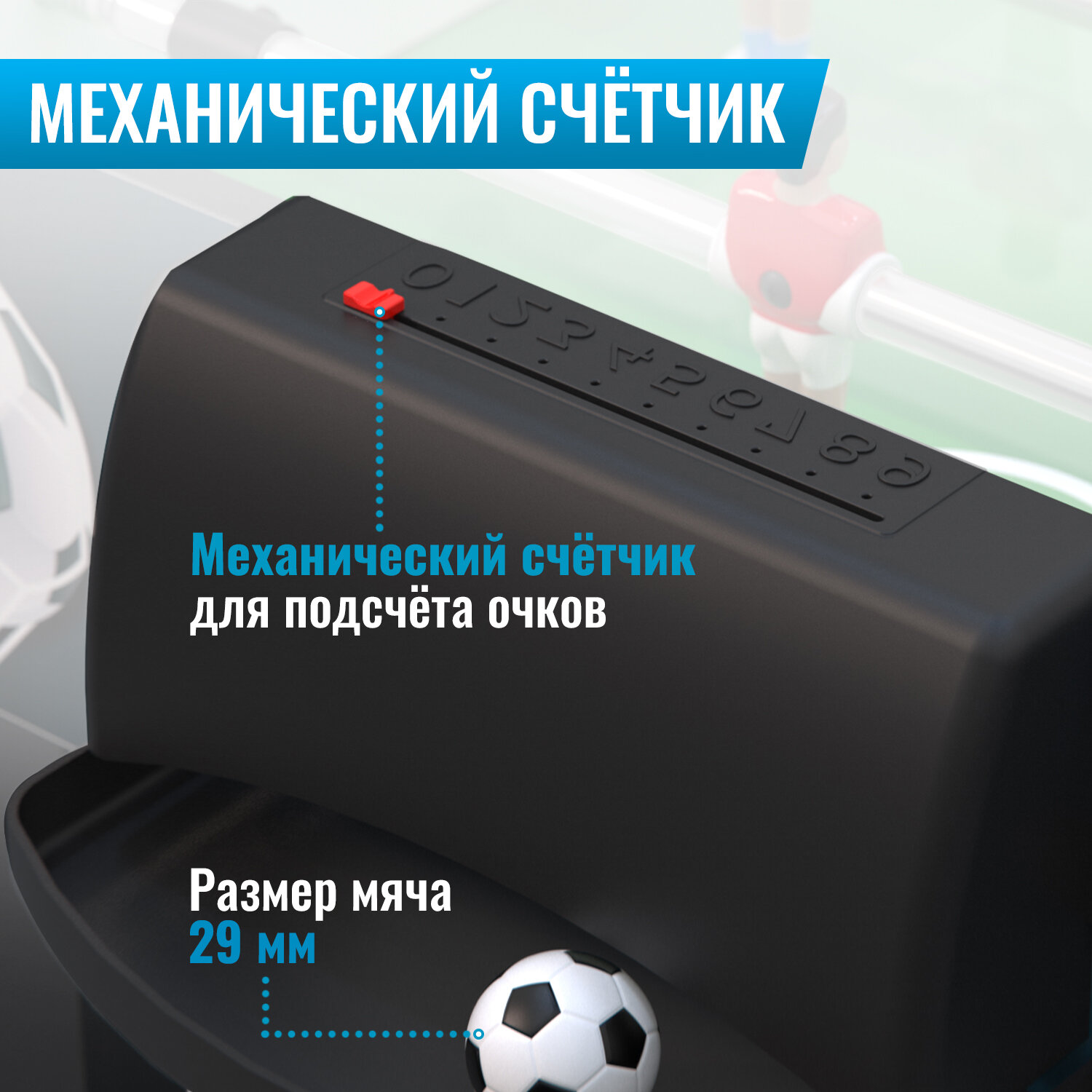 | Дополнительная информация | В комплекте с настольным футболом вы получите два футбольных мяча, которые обеспечат реалистичность игры, и механический счетчик для подсчета очков. |