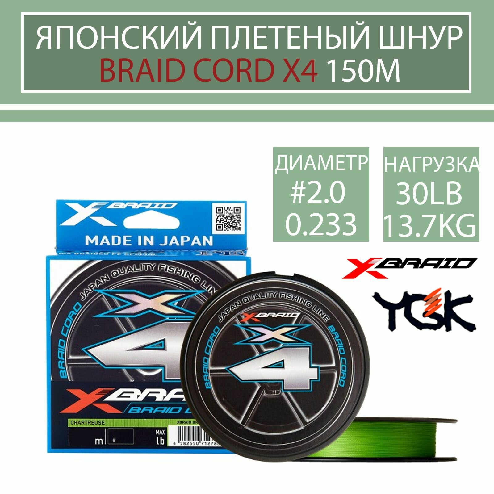 Ниже Вы можете прочитать отзывы на Шнур X-BRAID BRAID CORD X4 150m (col. Chart) #2.0 30 lb, ознакомится с подробными характеристиками, посмотреть интересные обзоры и фотографии на Шнур X-BRAID BRAID CORD X4 150m (col. Chart) #2.0 30 lb.