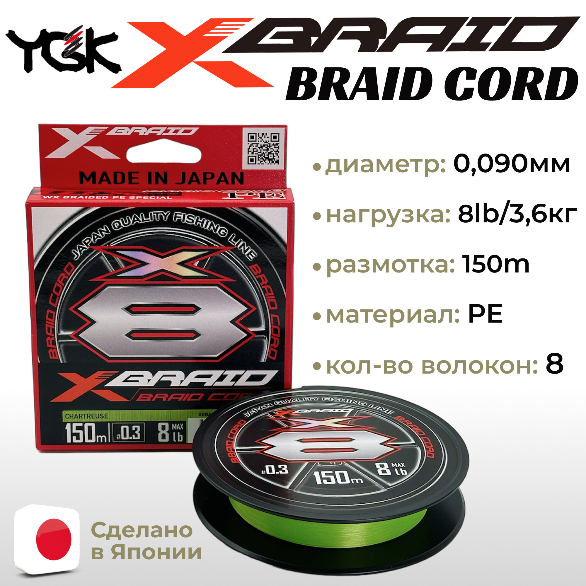 Плетеный шнур YGK X-BRAID BRAID CORD PE X4 150m #0.3 (6lb/2.7кг/0.090mm)
