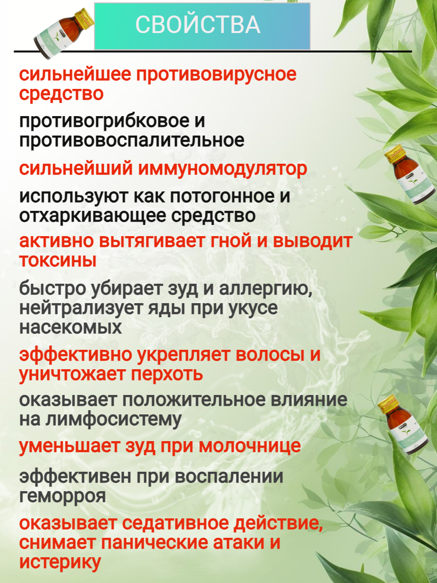 | Дополнительная информация | За счет специальной технологии переработки листьев и побегов, все полезные вещества и органические составляющие остаются в неизменном виде. Это говорит о высоком качестве и мощном положительном воздействии на организм. Масло используется не только в медицине, но и в косметологии и добавляется в продукты по уходу и гигиене за телом. |