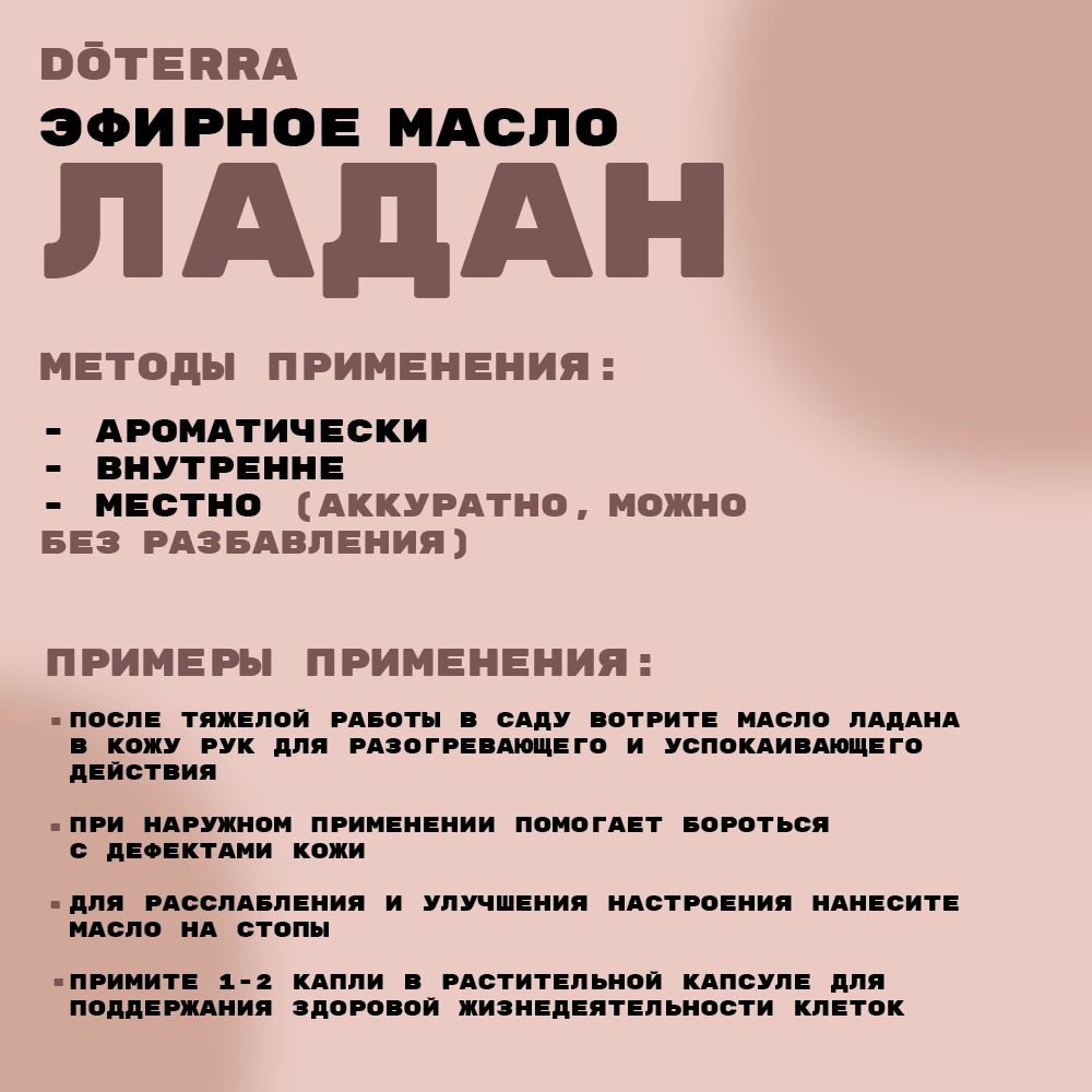 | Способ применения | распыление: Капните три-четыре капли масла в ваш любимый диффузор. Внутреннее применение: Растворите 1 каплю в 120 мл жидкости. Наружное применение: Нанесите одну или две капли масла на выбранный участок кожи. Разбавьте во фракционированном кокосовом масле doTERRA, чтобы снизить чувствительность кожи |