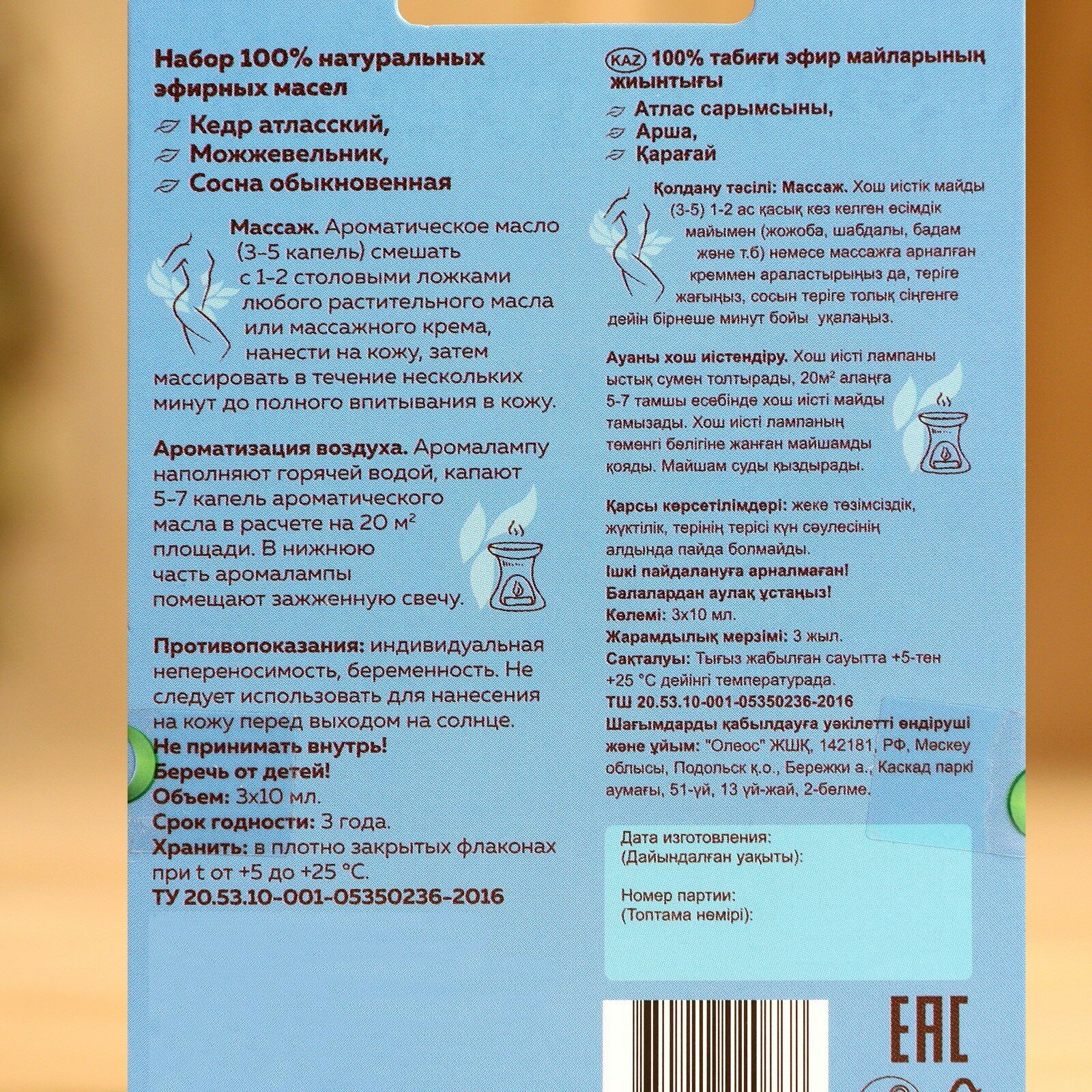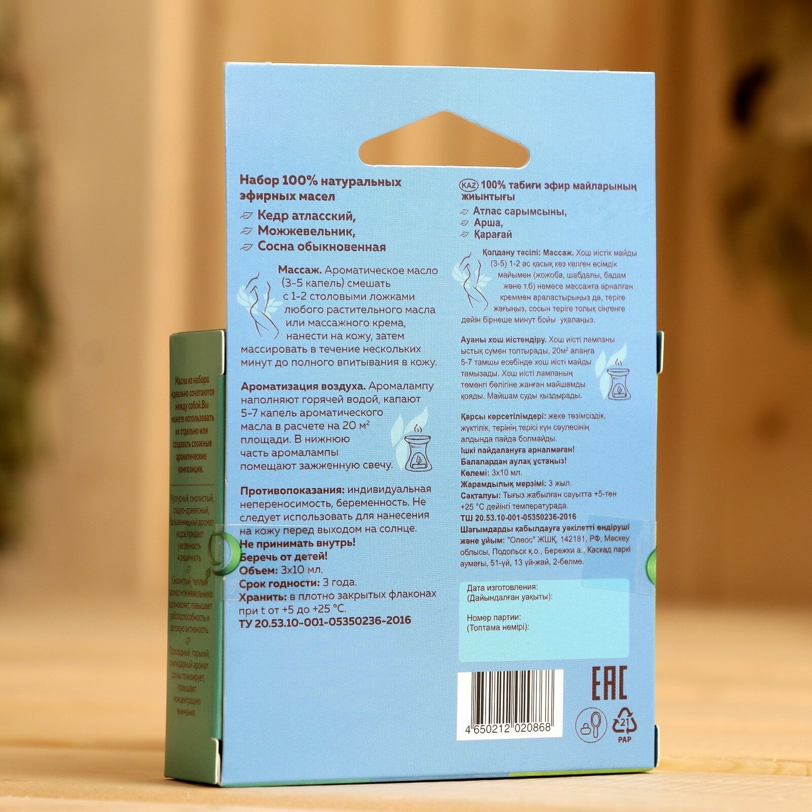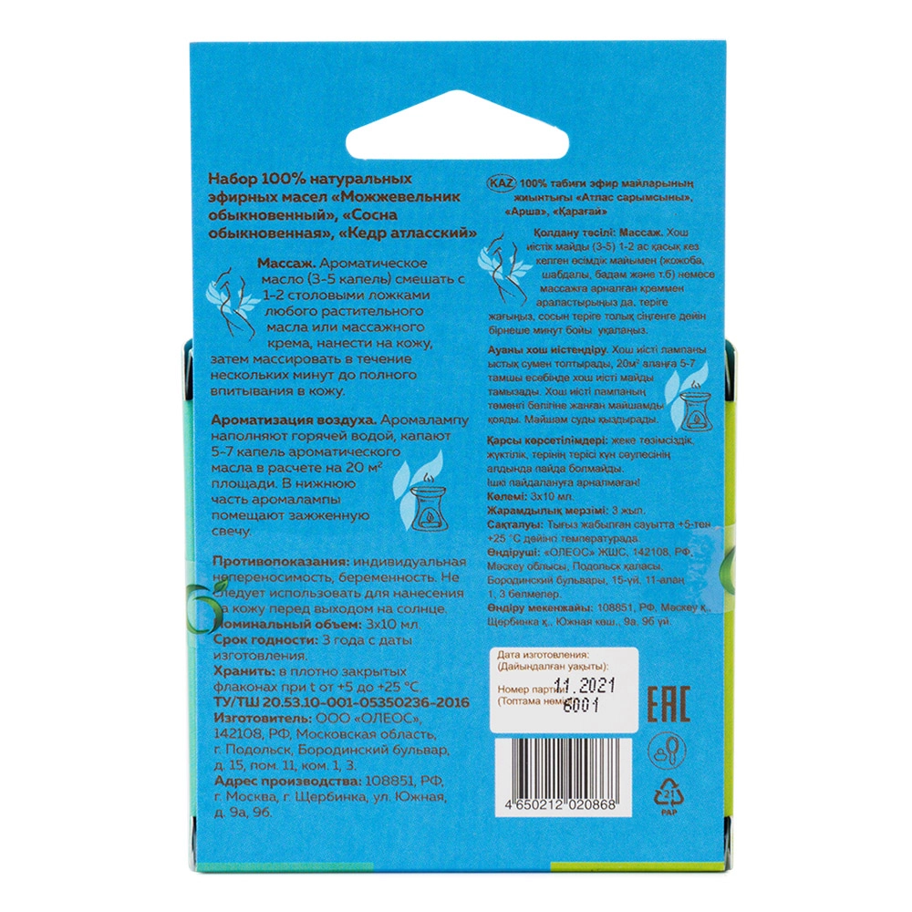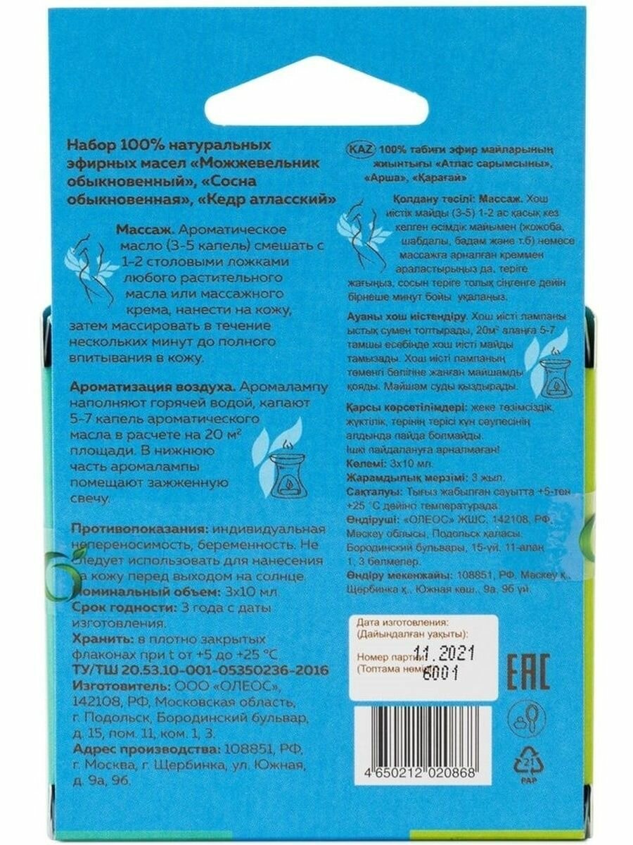 | В наборе | эфирное масло Кедр атласский 10 мл, эфирное масло Можжевельник обыкновенный 10 мл, эфирное масло Сосна обыкновенная 10 мл |