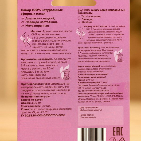 | Состав | Ароматическое масло «Дыня медовая», Состав INCI: Cymbopogon Citratus Leaf Oil, Cucumis Melo Aroma Oil Ароматическое масло «Клубника» Состав INCI: Vanilla Planifolia Fruit Oil, Fragaria Ananassa (Strawberry) Aroma Oil Ароматическое масло «Сирень» Состав INCI: Lavandula Officinalis Flower Oil, Syringa Vulgaris (Lilac) Aroma Oil. |