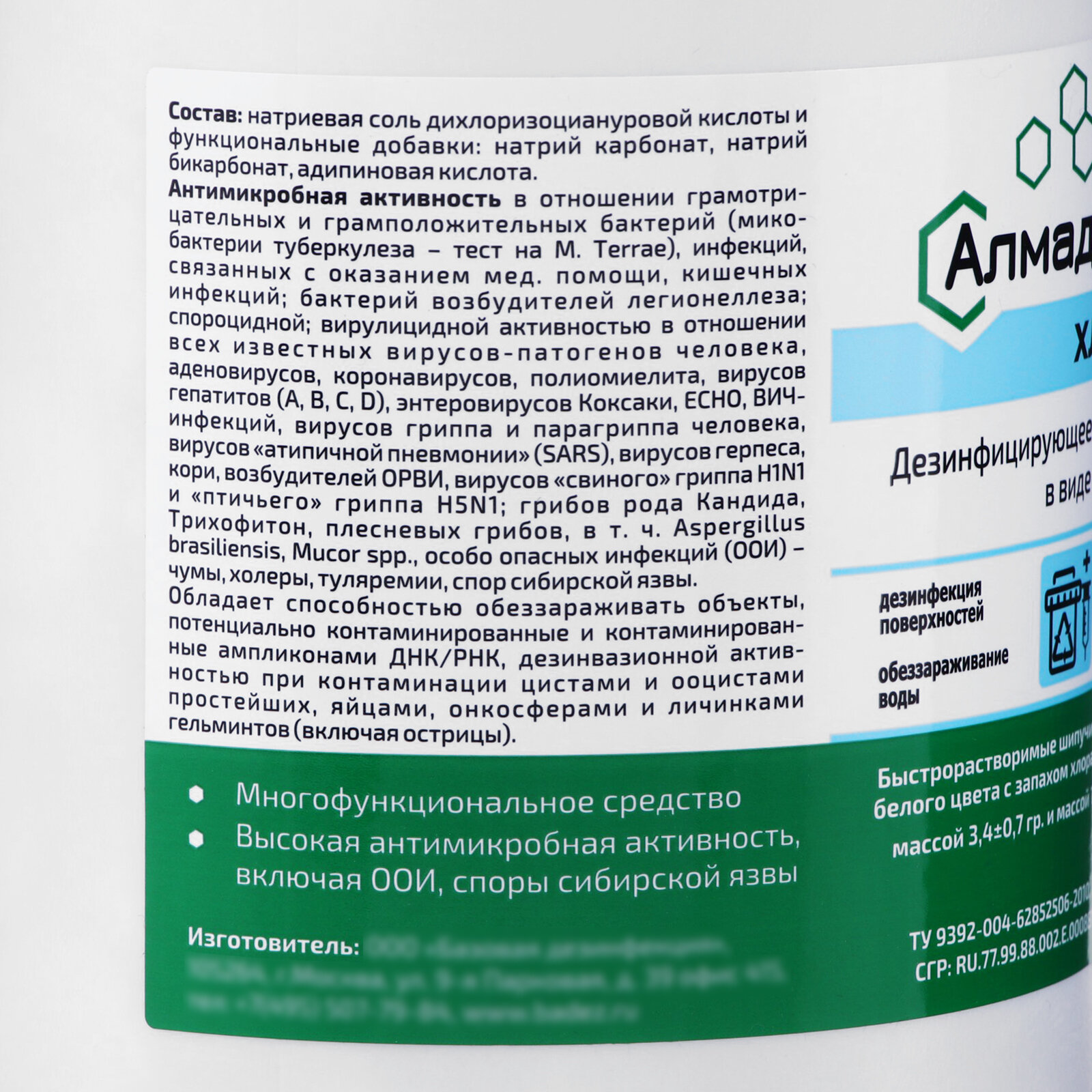 | Дополнительная информация | в качестве действующего вещества средство содержит натриевую соль дихлоризоциануровой кислоты (дихлоризоцианурат натрия). Действующим веществом является активный хлор, выделяющийся при взаимодействии средства с водой |