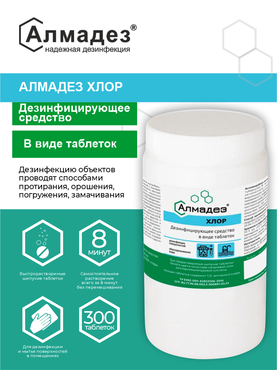 Дезинфицирующее средство "Алмадез-хлор", 300 таблеток, 1кг