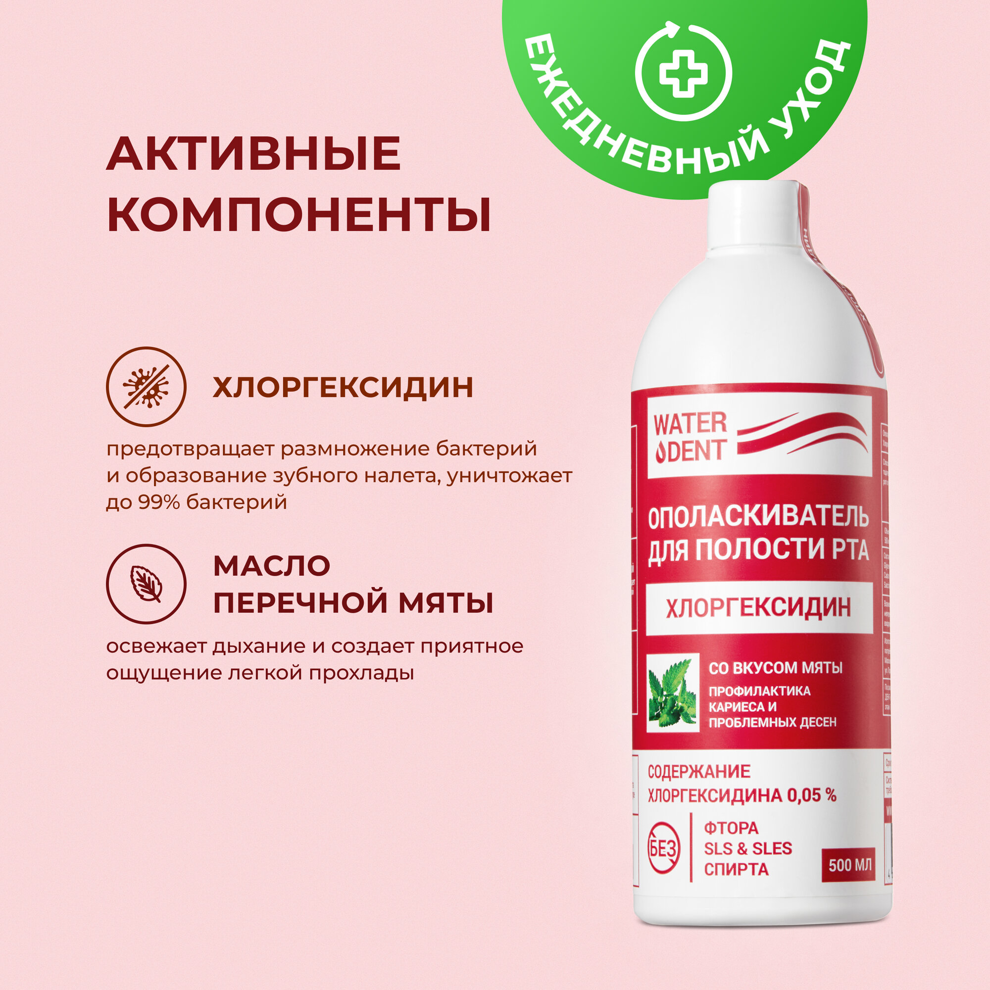 Ополаскиватель для полости рта WATERDENT / Хлоргексидин 0,05% / Со вкусом мяты / 500 мл