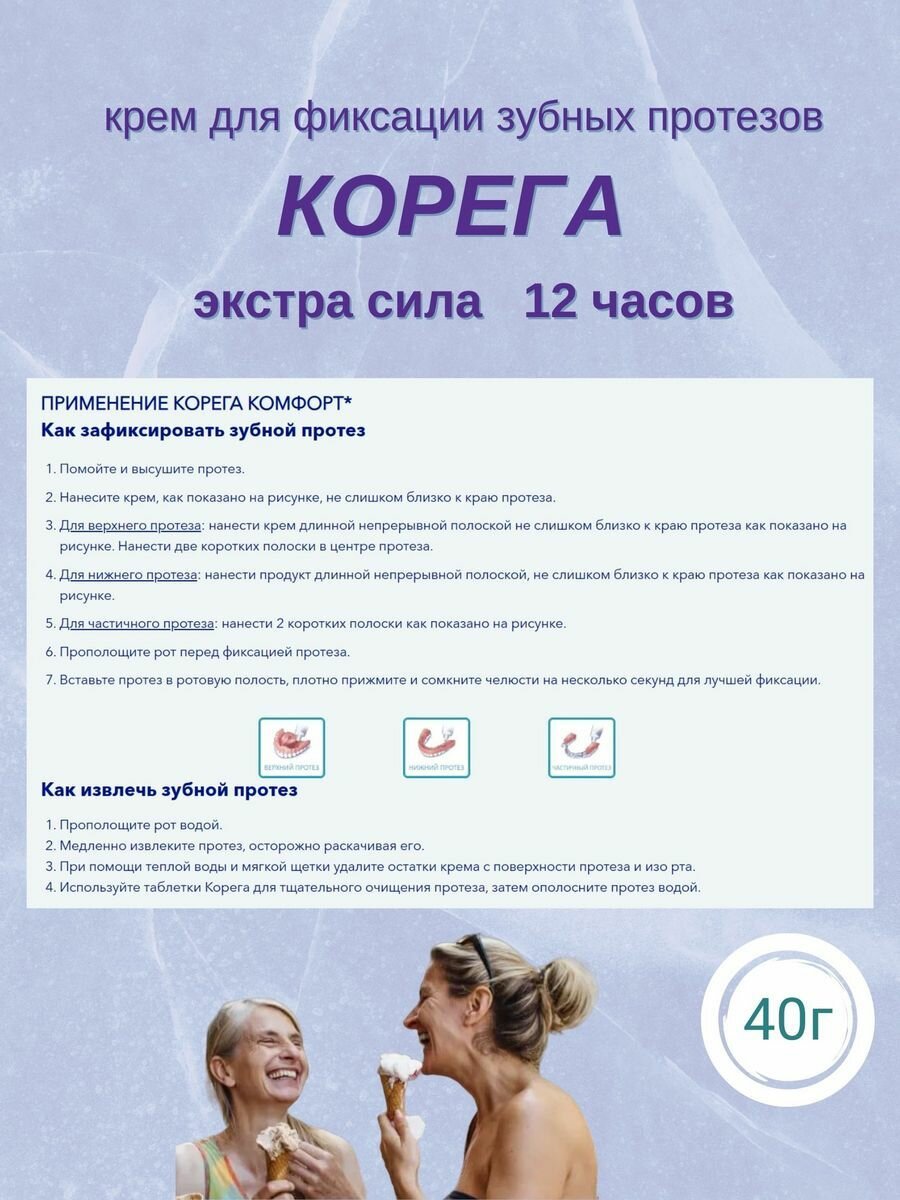 | Способ применения | нанесение: помойте и высушите протез. Нижний протез: нанесите крем Корега Максимальное Прилегание длинной полоской вдоль кромки протеза (но не слишком близко к ней). Верхний протез: нанесите крем Корега Максимальное Прилегание длинной полоской вдоль кромки протеза (но не слишком близко к ней), нанесите две короткие полоски в центральной части протеза. Извлечение: прополощите рот водой, затем медленно извлеките протез, осторожно раскачивая его. При помощи теплой воды и зубной щетки с мягкой щетиной удалите остатки крема с поверхности протеза и изо рта |