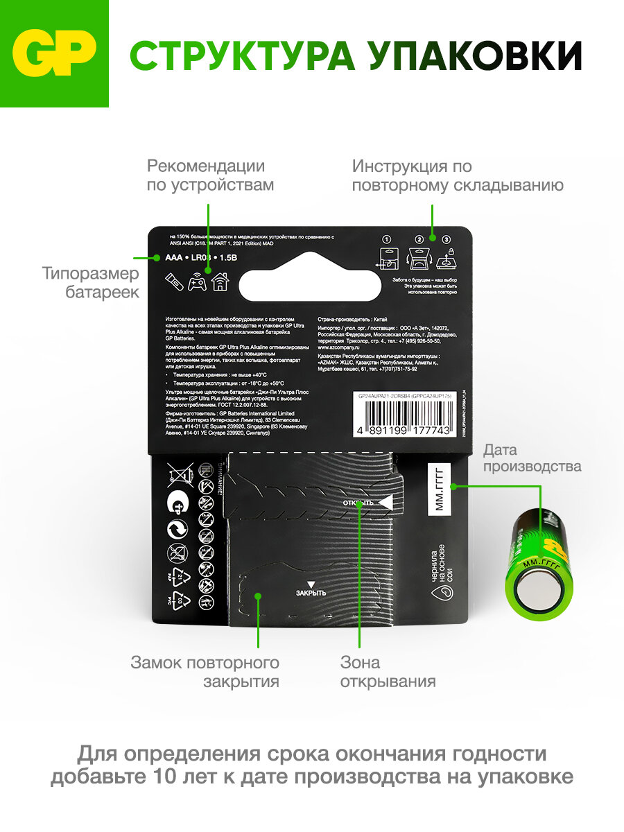 Батарейка GP Ultra Plus AAA/LR03 24AUP алкалиновая, BC4 (картон, 40шт.) (24AUPA21-2CRSB4)