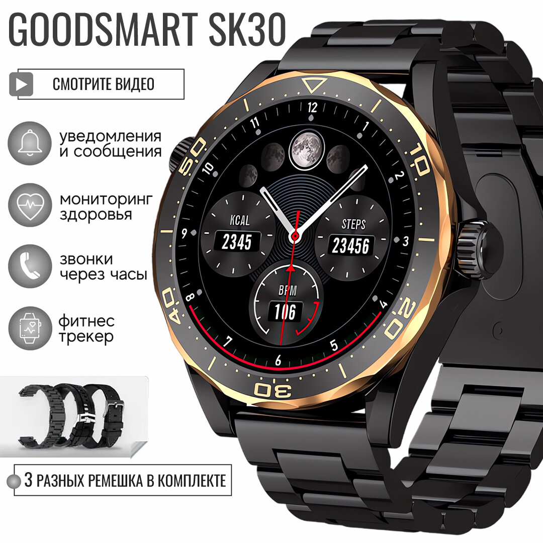 Умные смарт часы мужские GoodSmart SK30 чёрно-золотого цвета, AMOLED экран