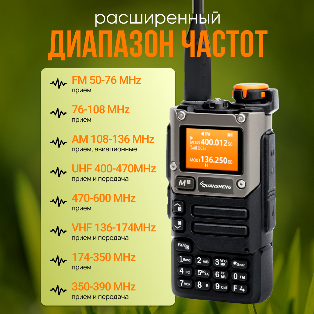 | Диапазон частот | UHF, VHF, авиационный диапазон, морской диапазон, речной диапазон |
