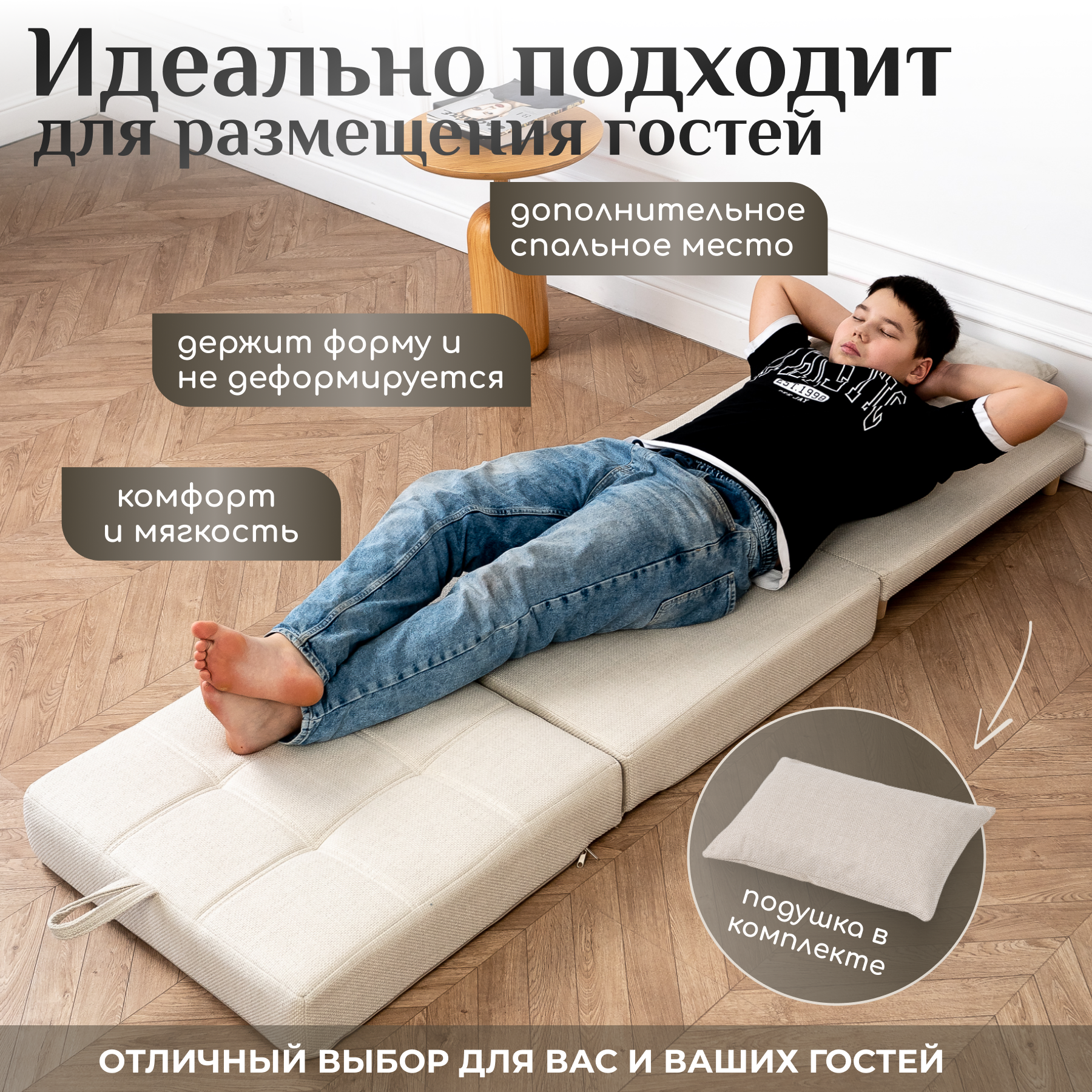 Пуф трансформер кровать раскладушка бежевая рогожка с подушкой