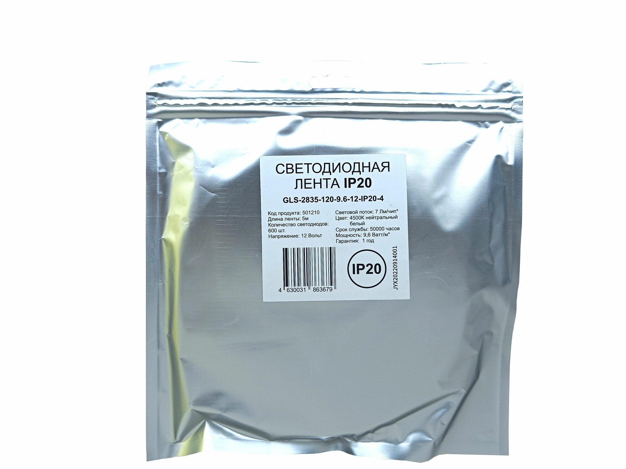 General, Светодиодная лента серия STANDART, Мощность 9,6 Вт/1 м, нейтральный белый 4500К, 12 вольт, Диодов на метр 120 шт., IP20, Длина 5 м